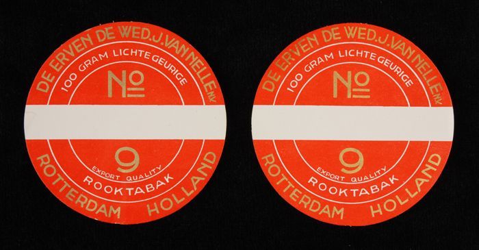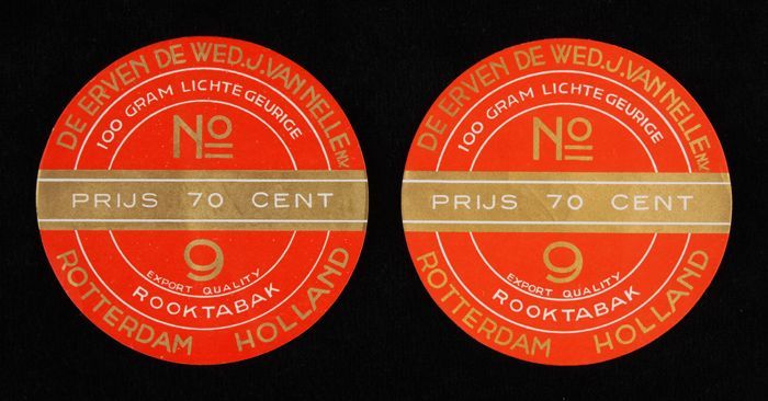 Twee rode, ronde labels VAN NELLE TABAK, No. 9, 100 ...