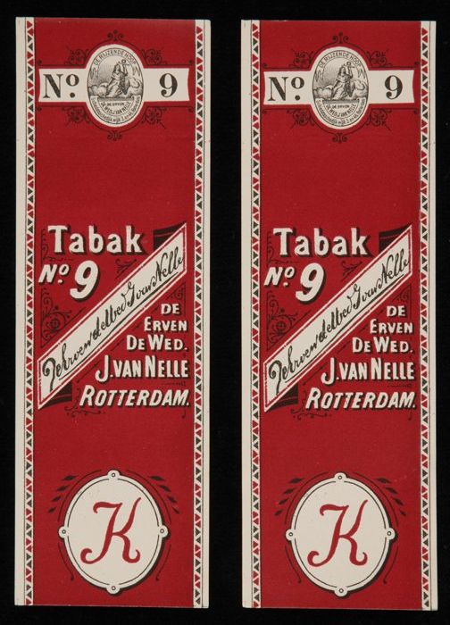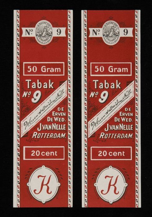 Twee donkerrode labels VAN NELLE TABAK, No. 9