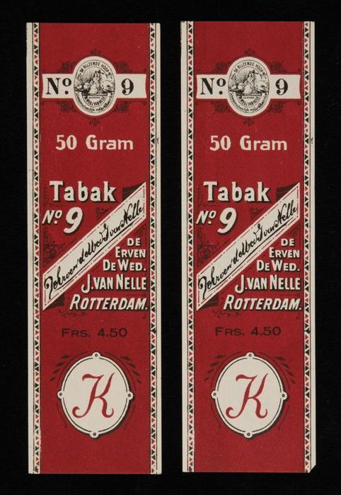 Twee donkerrode labels VAN NELLE TABAK, No. 9, 50 gr...