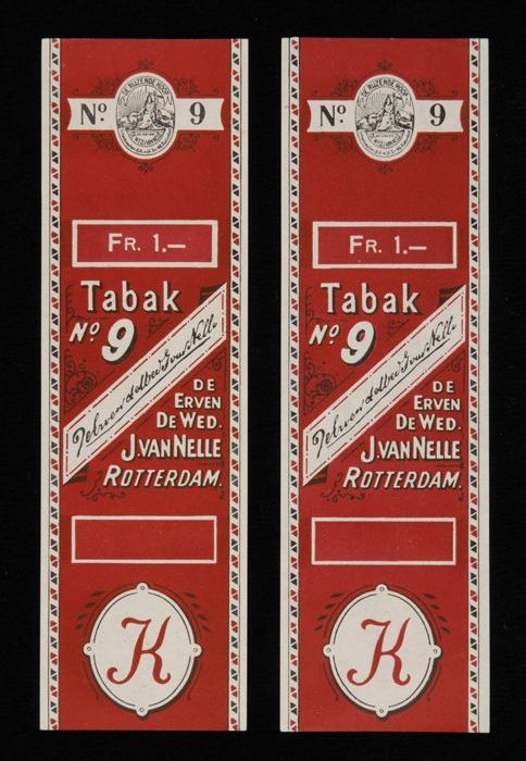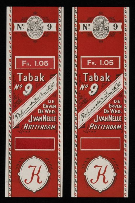 Twee donkerrode labels VAN NELLE TABAK, No. 9, fr. 1,-