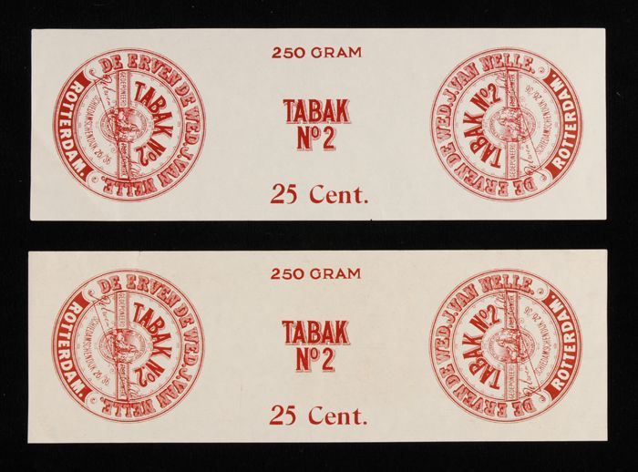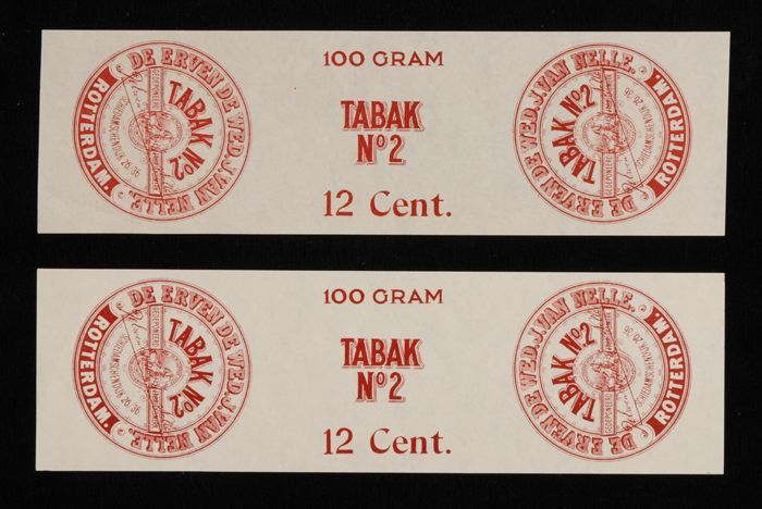 Twee witte labels VAN NELLE TABAK, No. 2, 100 gram, 12¢
