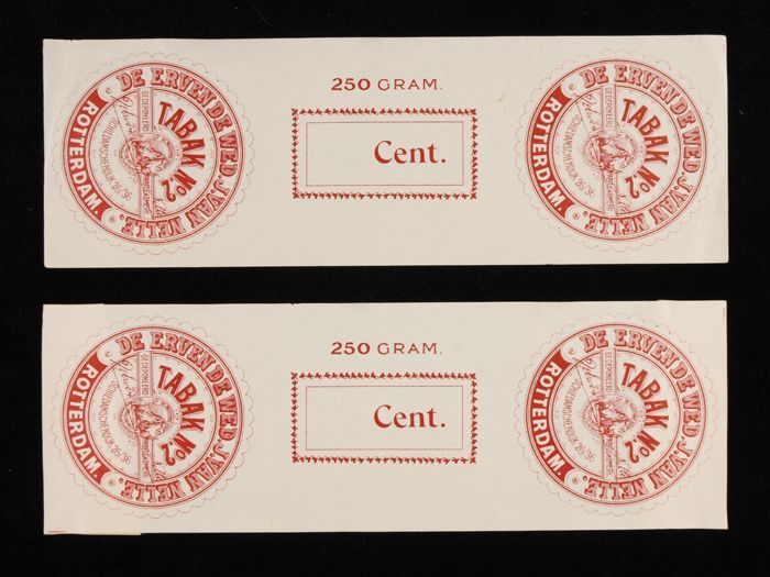 Twee donkerrode labels VAN NELLE TABAK, No. 3, 250 g...