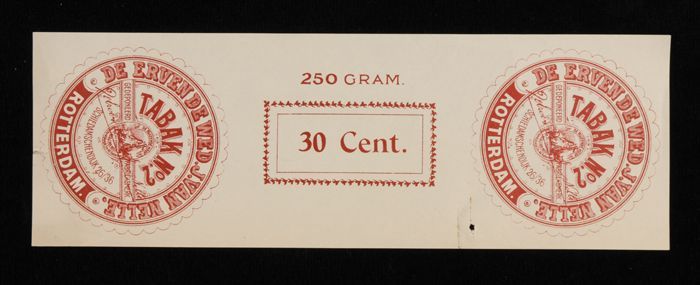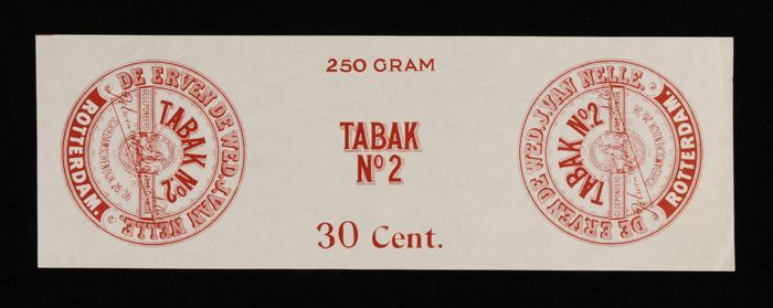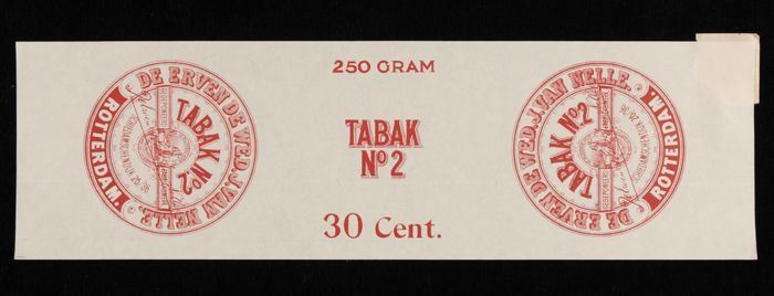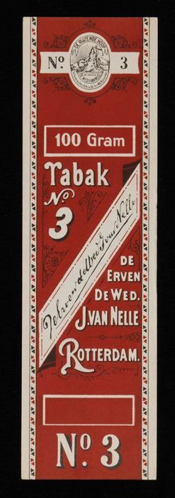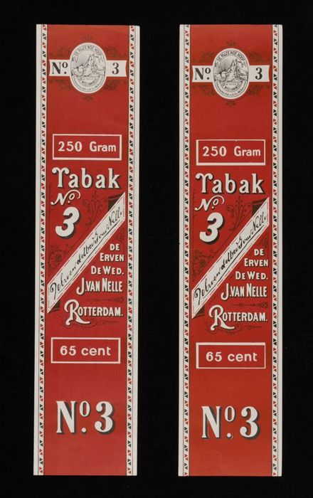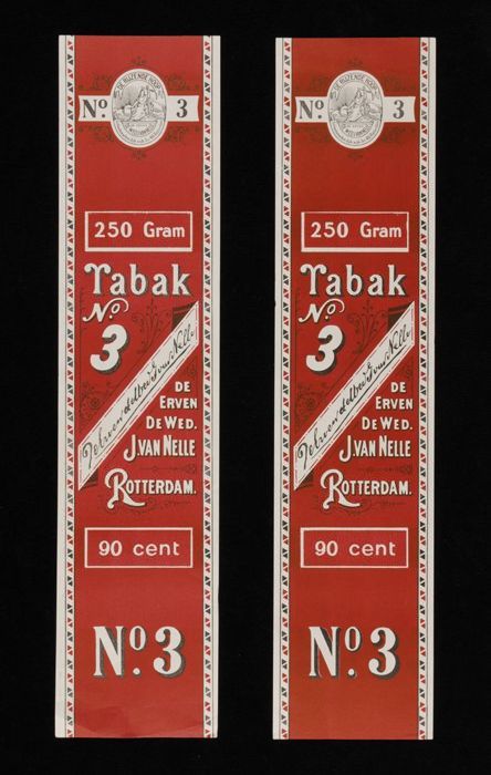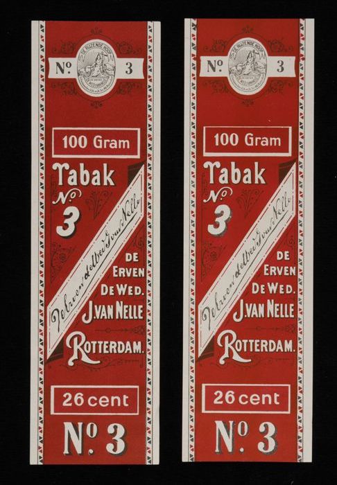 Twee donkerrode labels VAN NELLE TABAK, No. 3, 100 g...