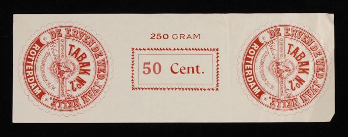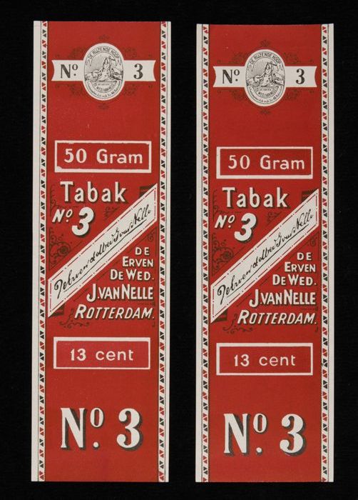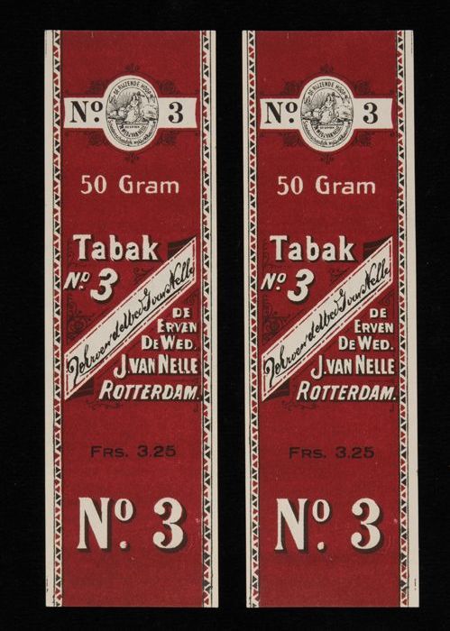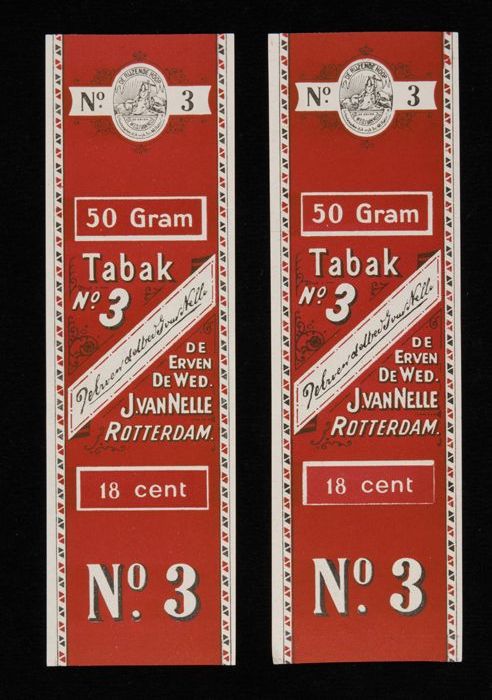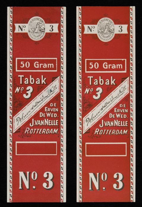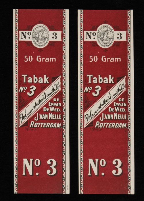 Twee donkerrode labels VAN NELLE TABAK, No. 3, 50 gr...