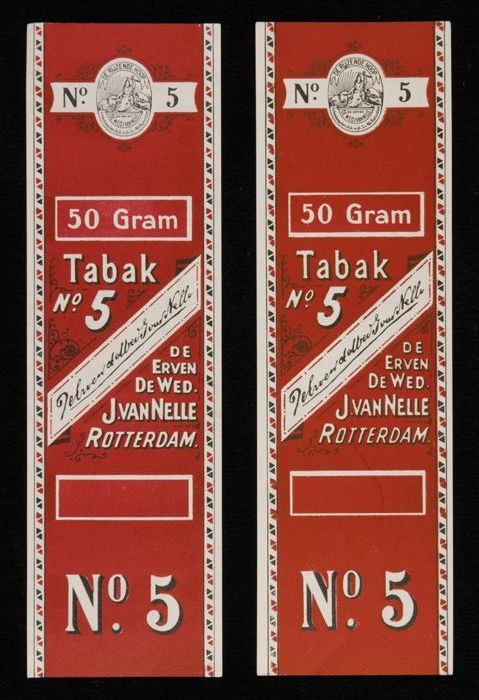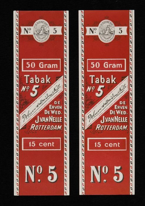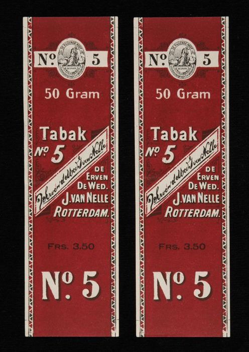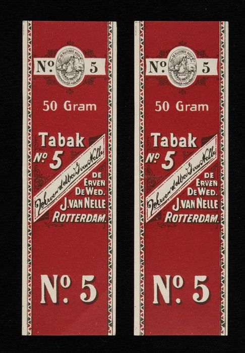 Twee donkerrode labels VAN NELLE TABAK, No. 5, 50 gr...