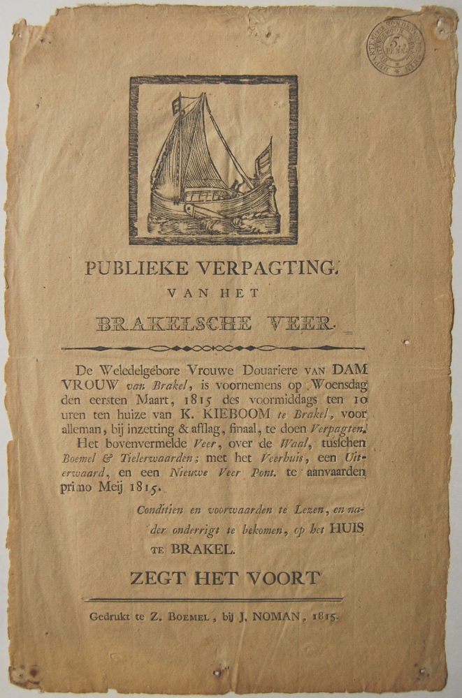 Affiche Publieke verpachting Veer Brakel. Druk. J. N...