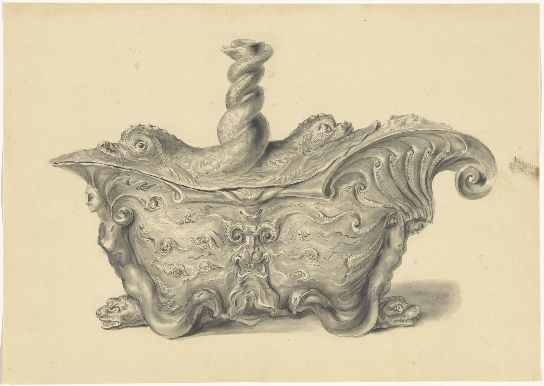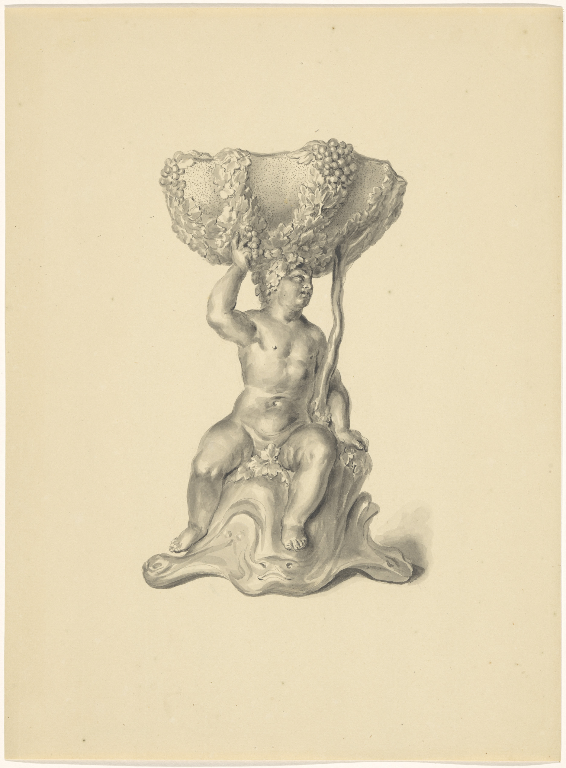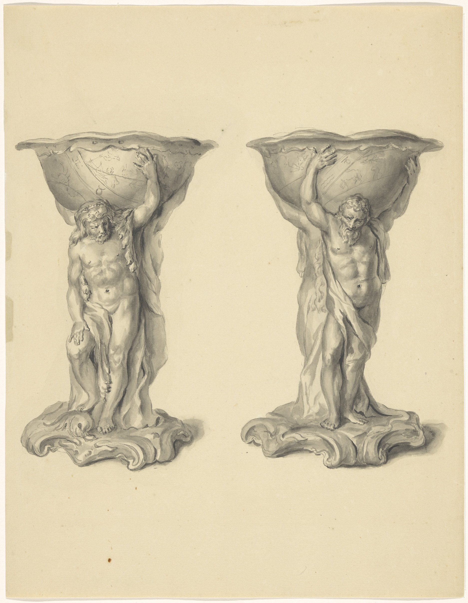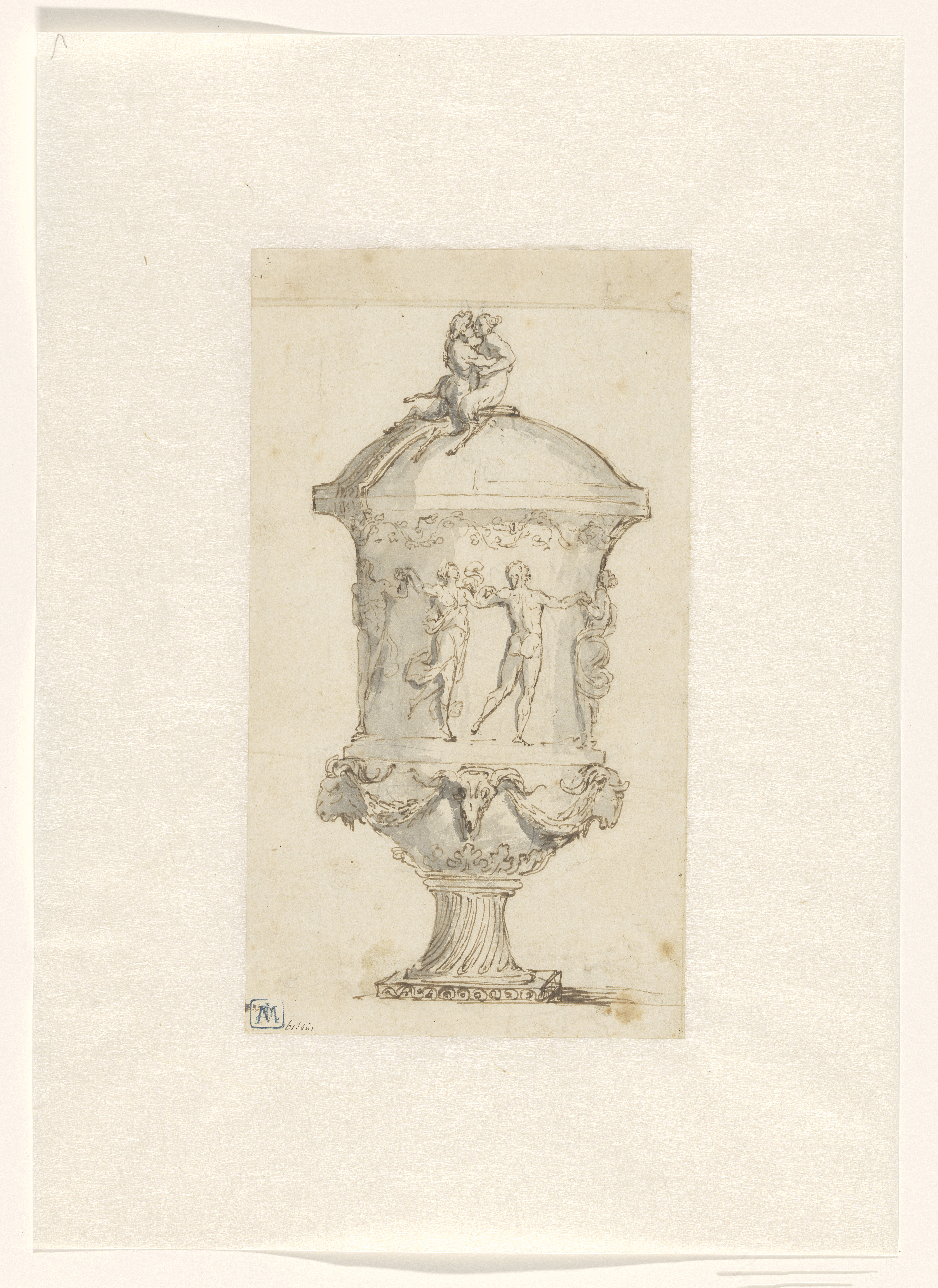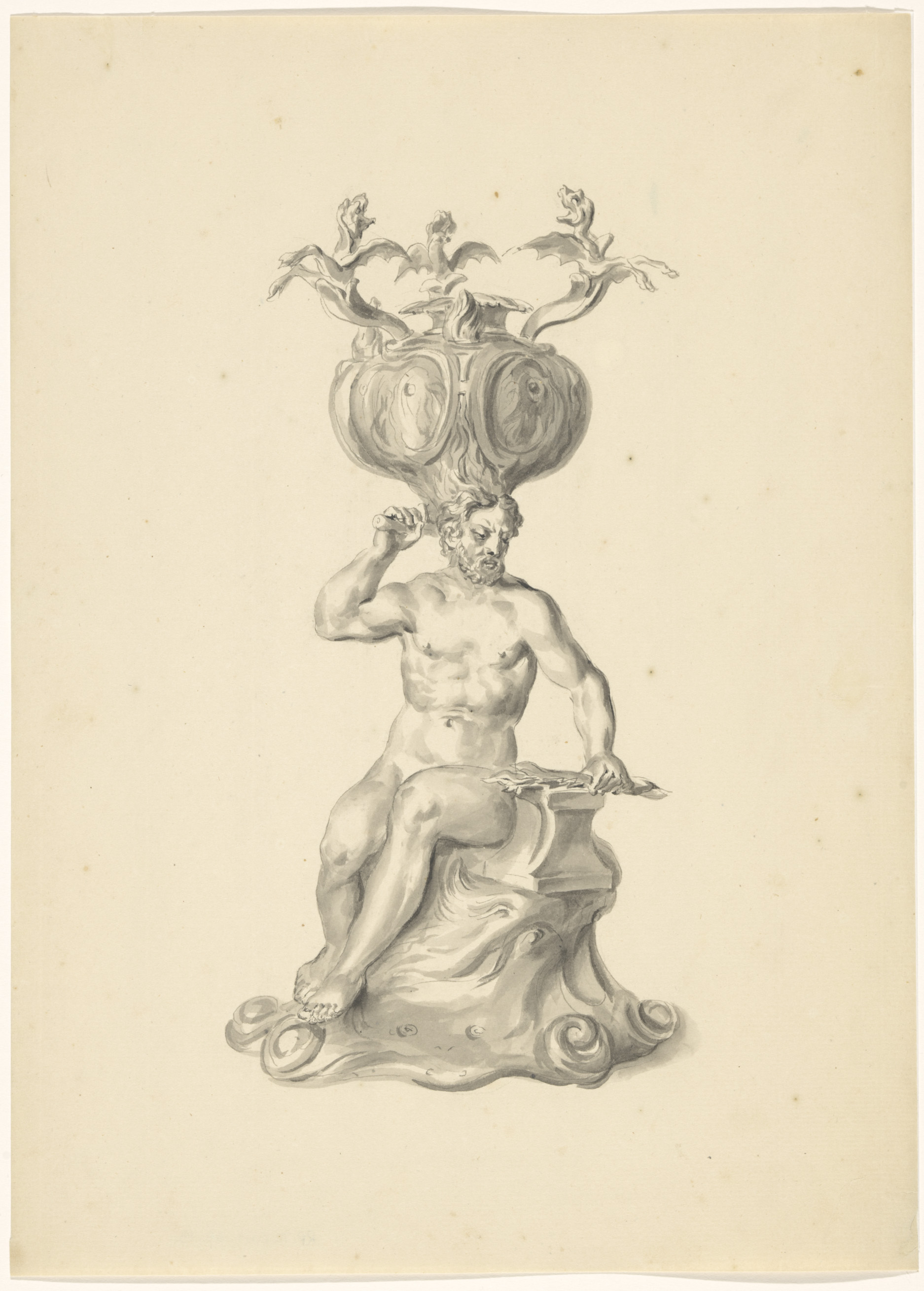 Ontwerptekening voor een vaas met een satyrpaar op h...
