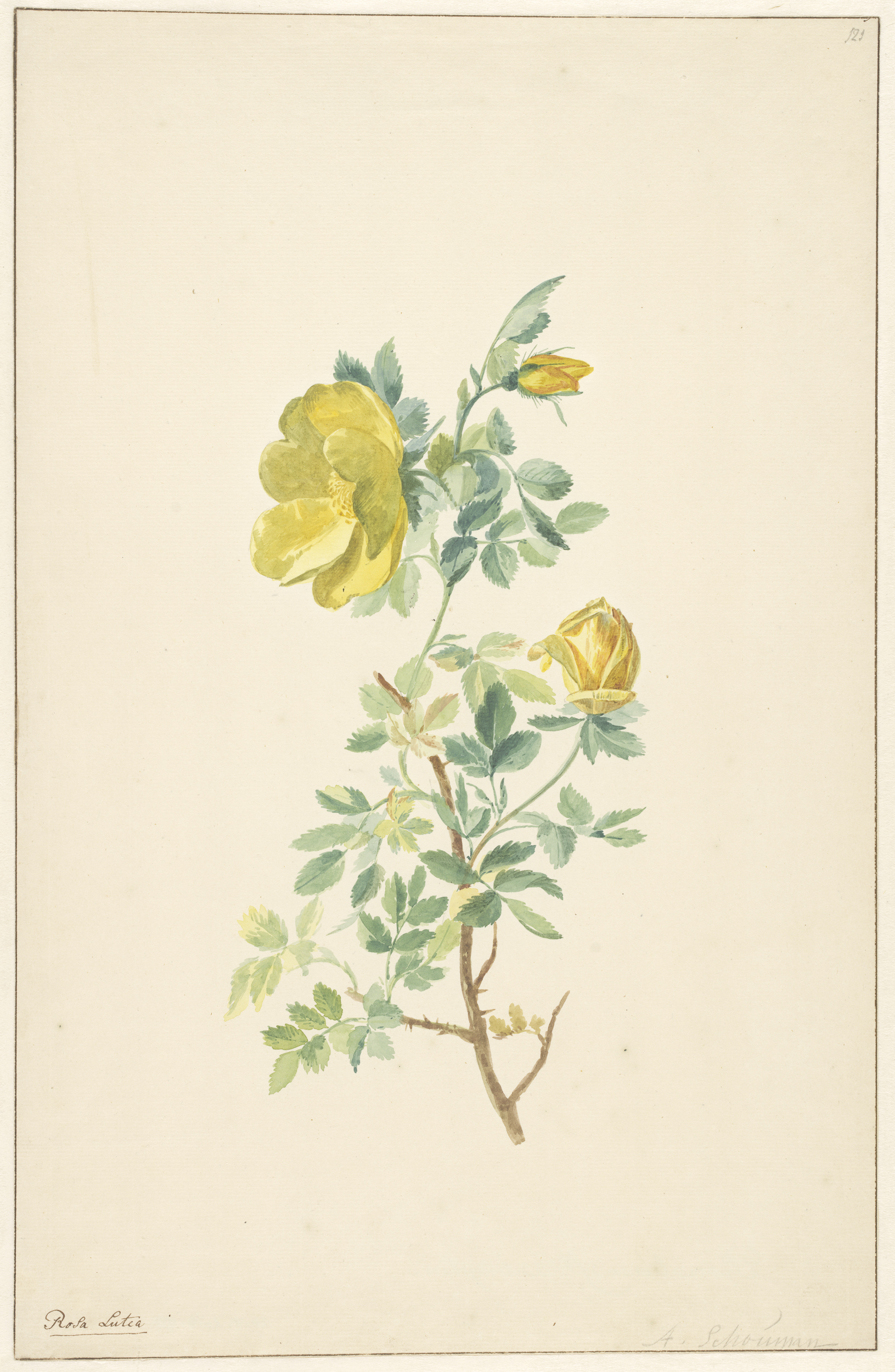 Tak van een gele roos (Rosa Lutea)