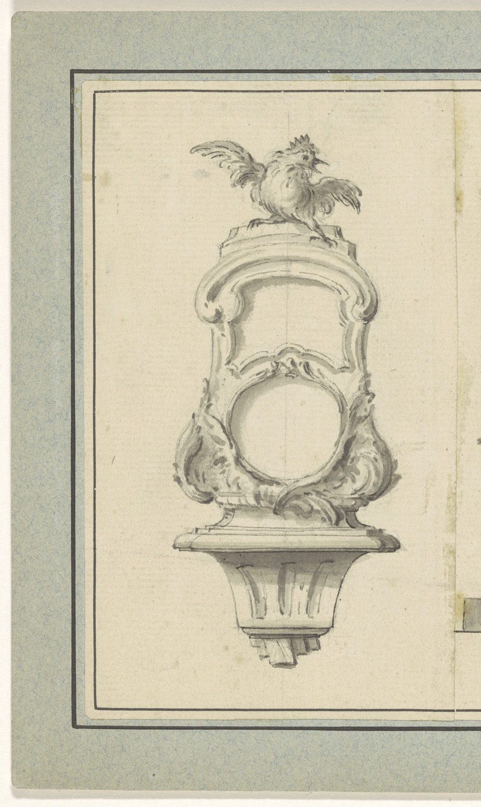 Ontwerptekening wandklok bekroond door een kraaiende...
