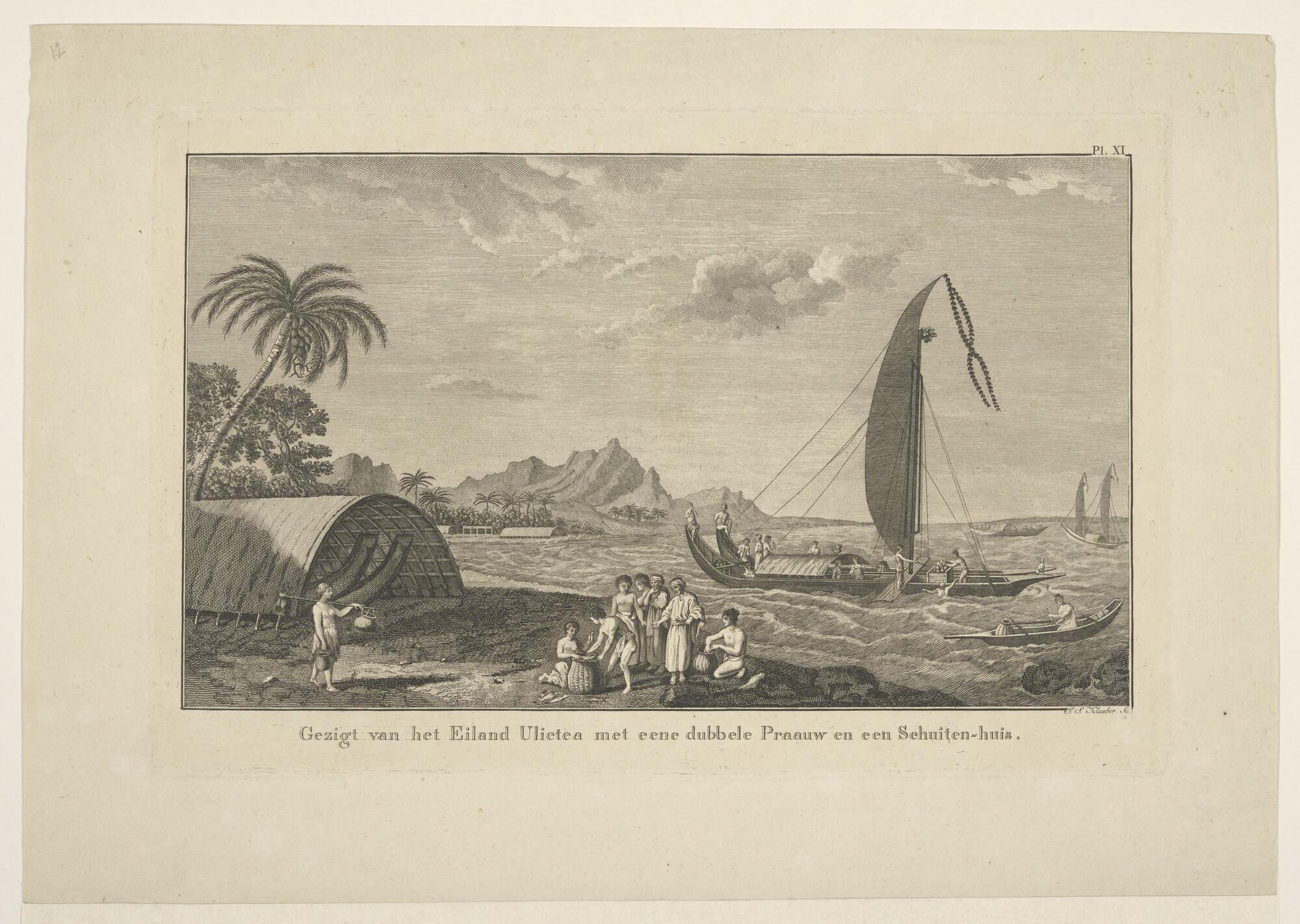 Gezicht op het eiland Ulietea, met een dubbele prauw...