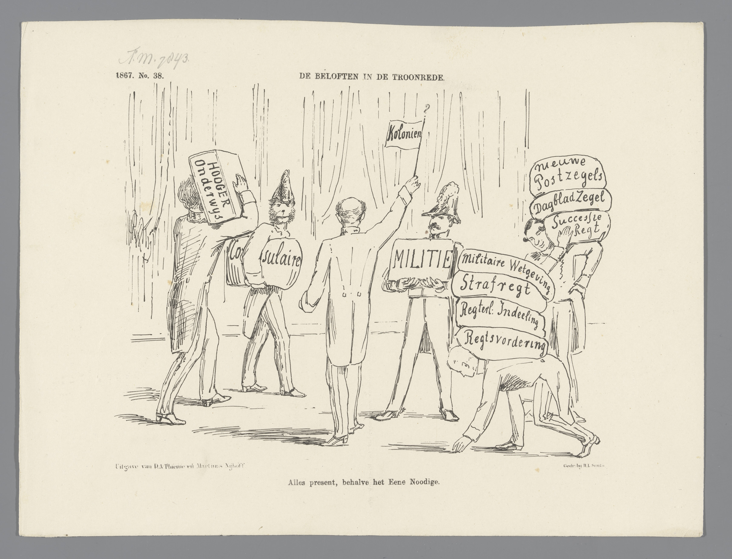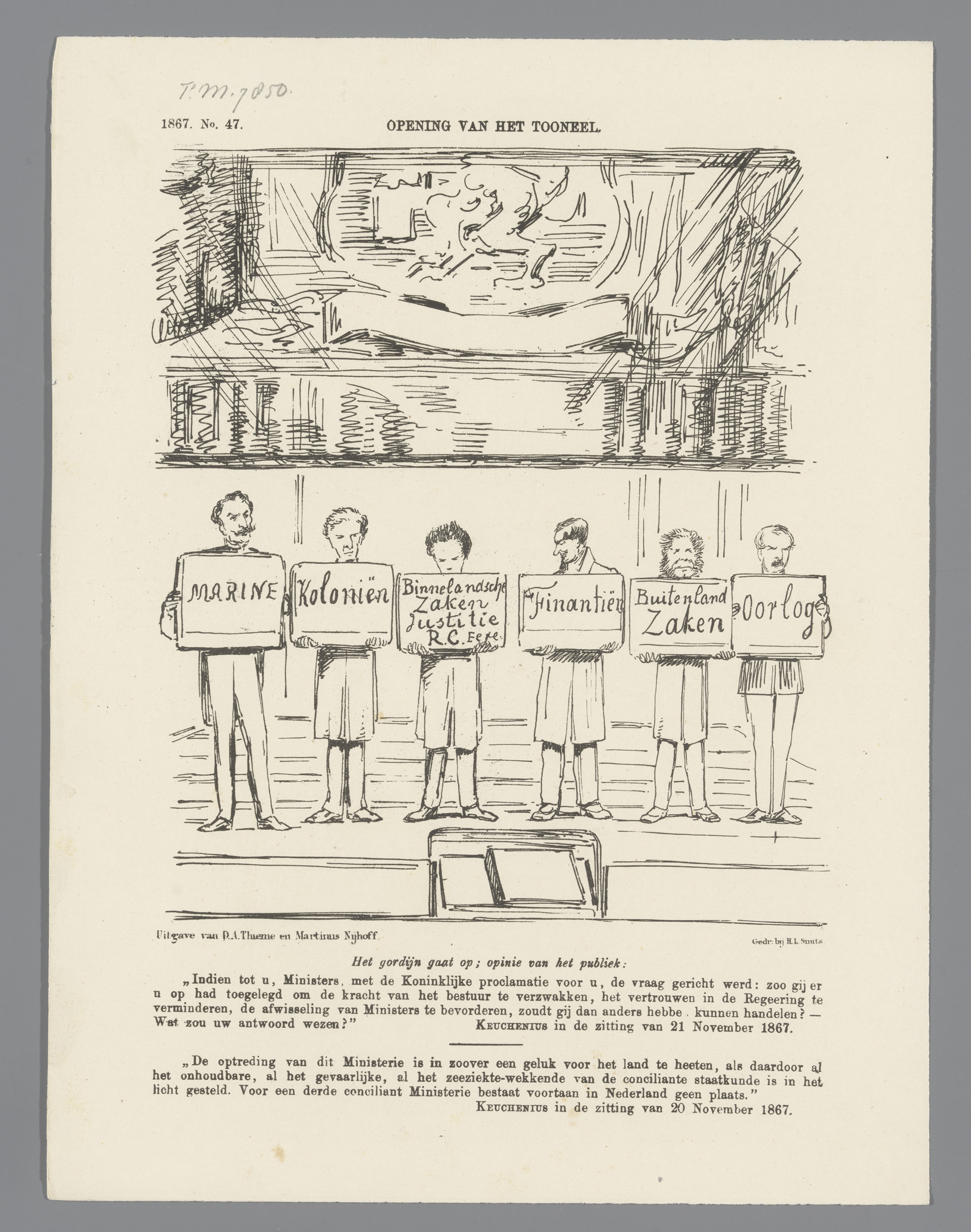 Spotprent met ministers met hun portefeuilles, 1867