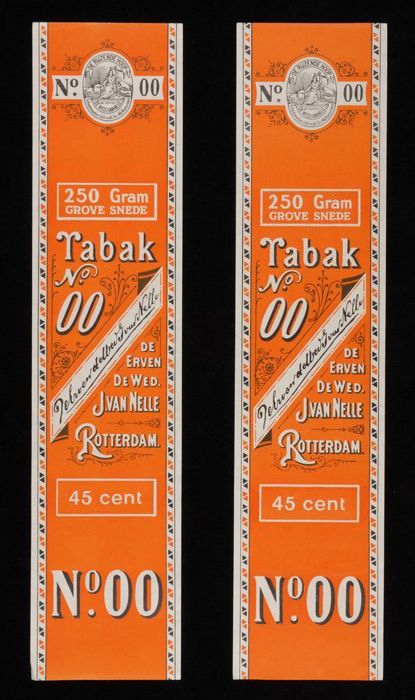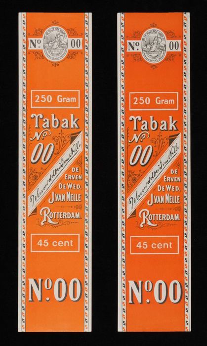 Twee oranje labels VAN NELLE TABAK, No. 00, 250 gram...
