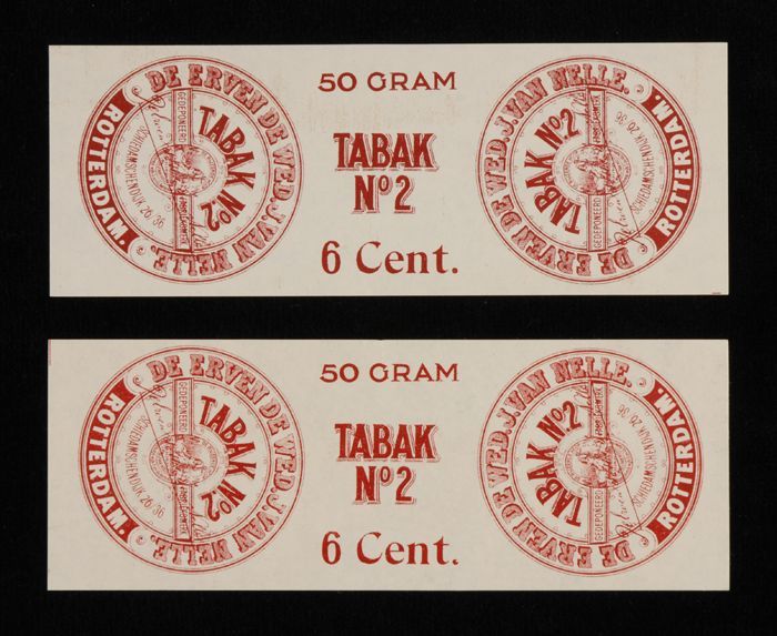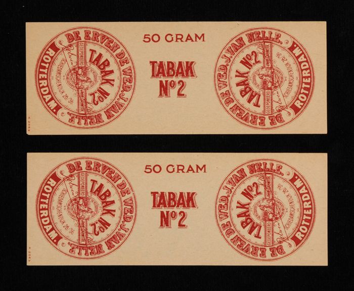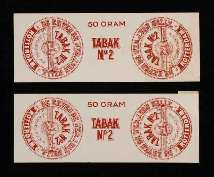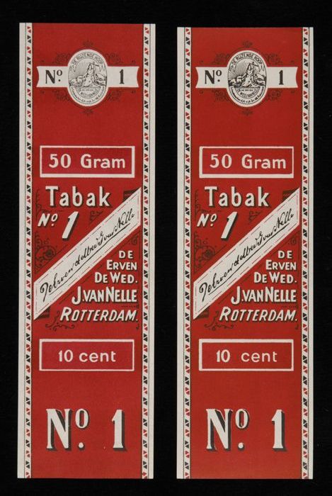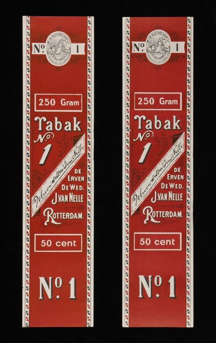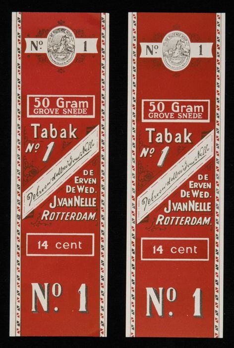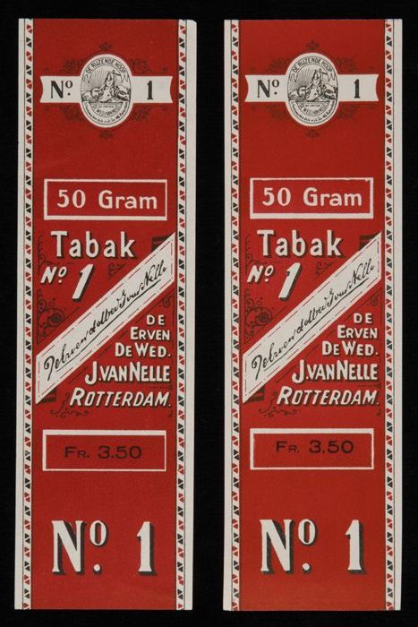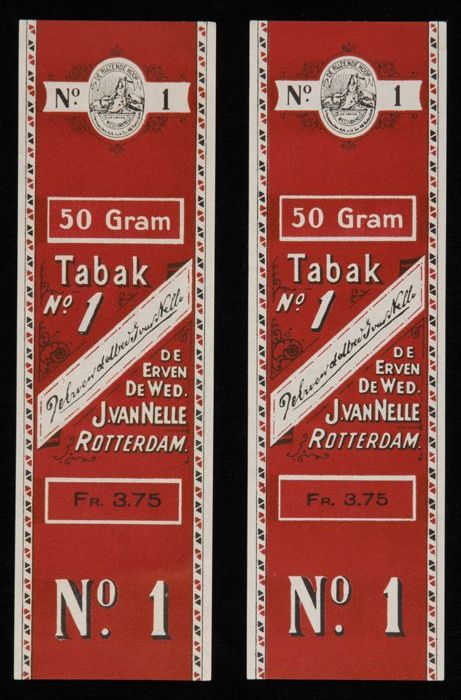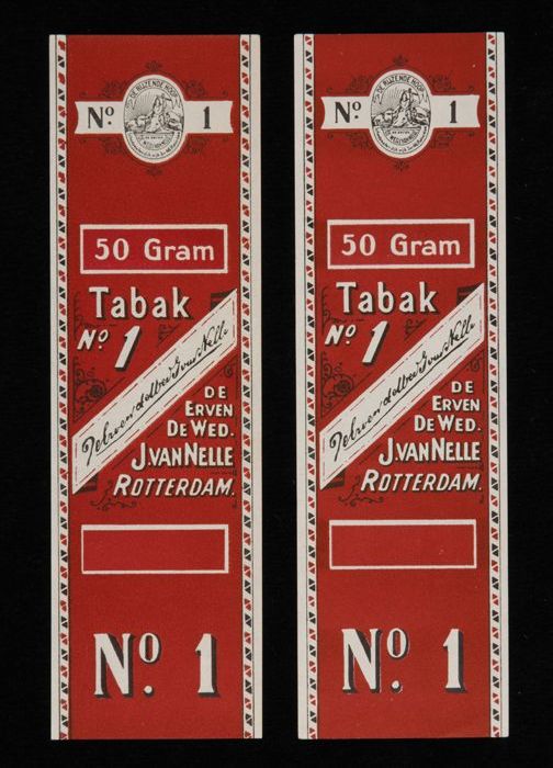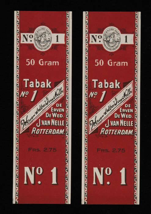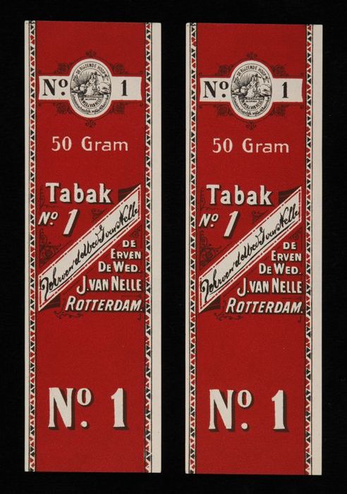 Twee donkerrode labels VAN NELLE TABAK, No. 1, 50 gr...