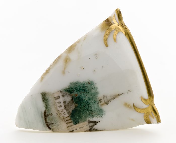 Fragment van porseleinen kop met vergulde rand en af...