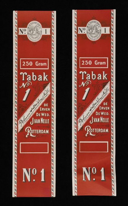 Twee donkerrode labels VAN NELLE TABAK, No. 1, 250 g...