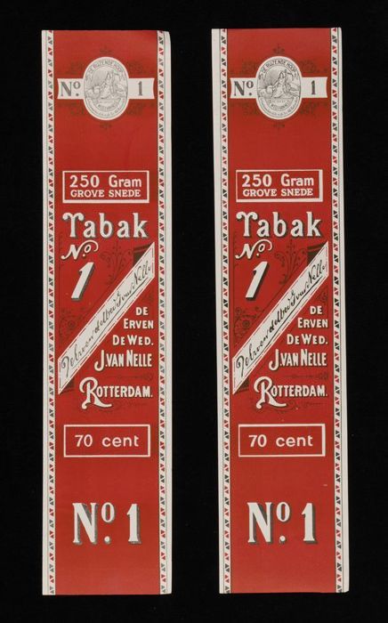 Twee donkerrode labels VAN NELLE TABAK, No. 1, 100 g...