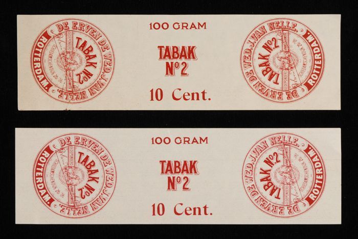 Twee witte labels VAN NELLE TABAK, No. 2, 100 gram, 10¢