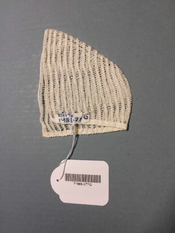 Bol floddermuts van ajour breiwerk, onderdeel van gr...