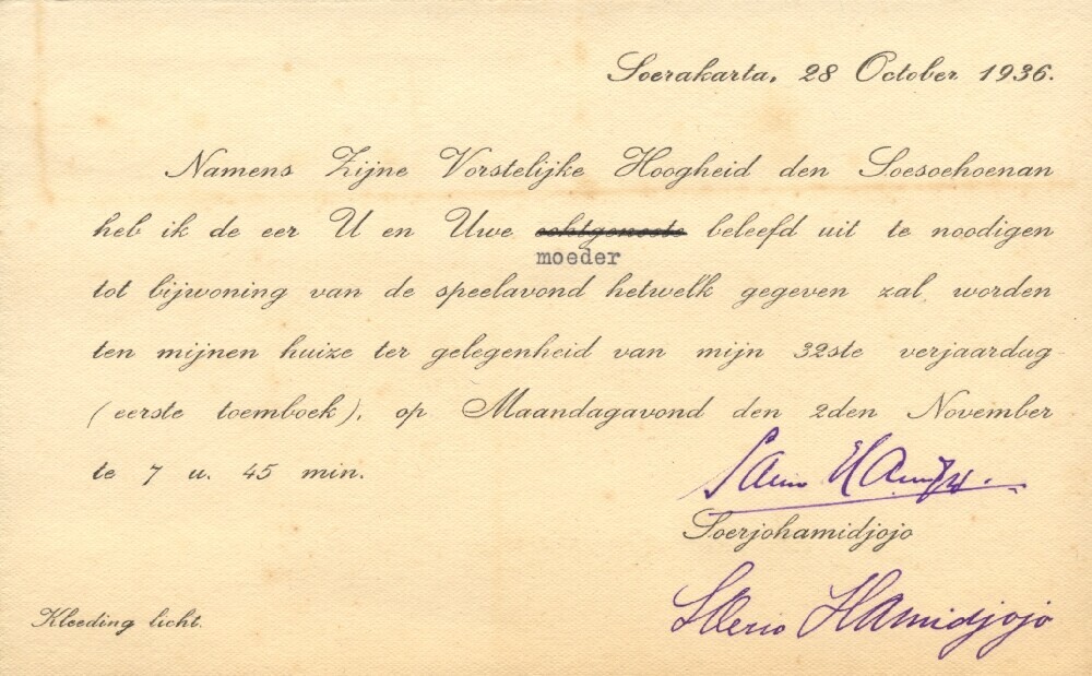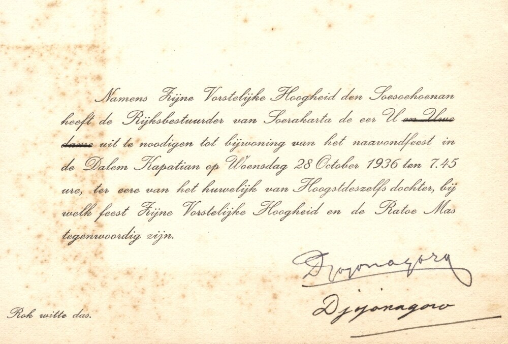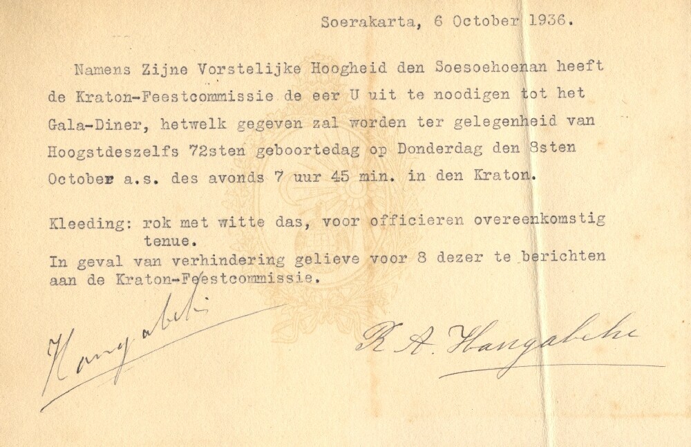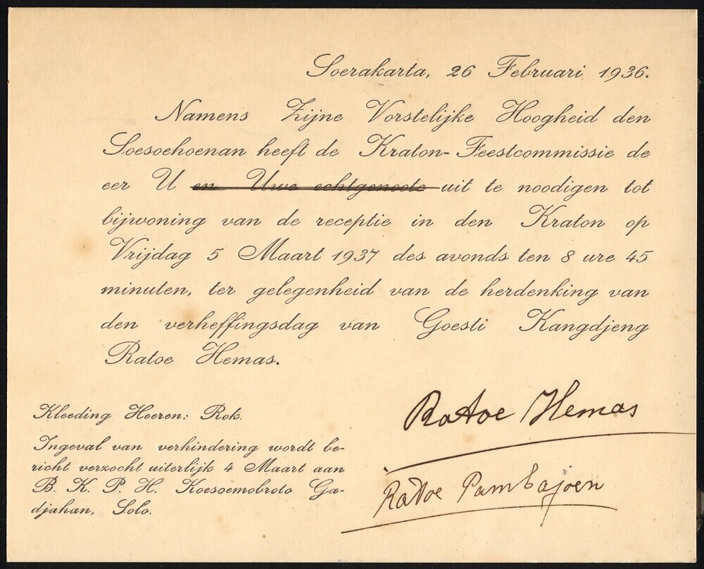 Uitnodiging namens Vorstelijke Hoogheid Soesoehoenan...