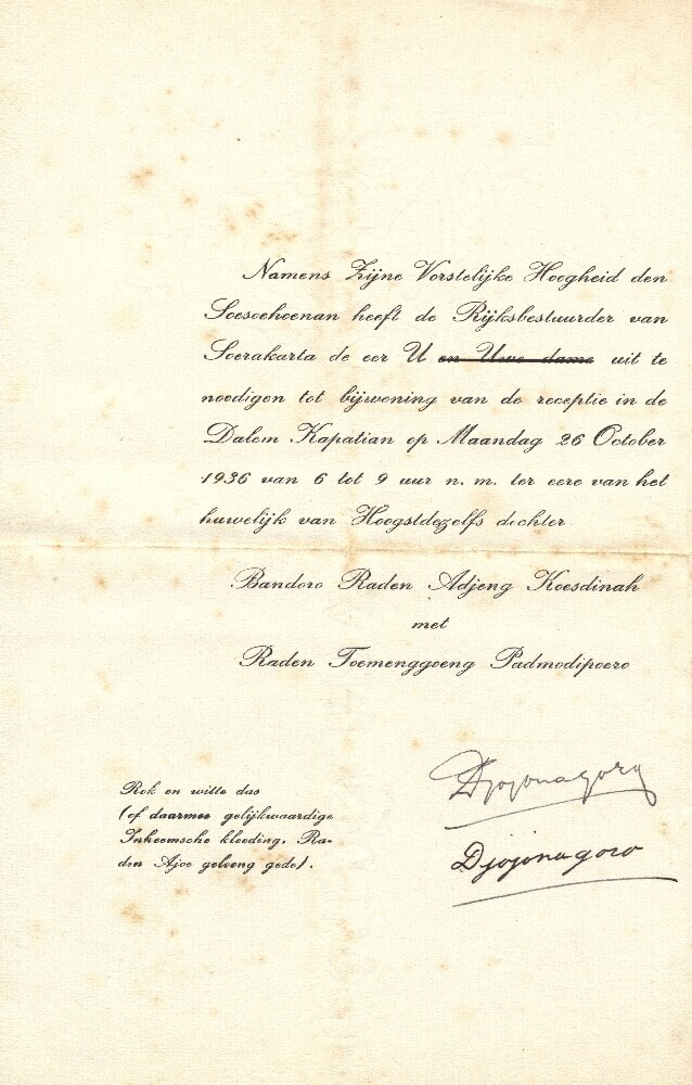 Uitnodiging namens de Soesoehoenan voor het bijwonen...