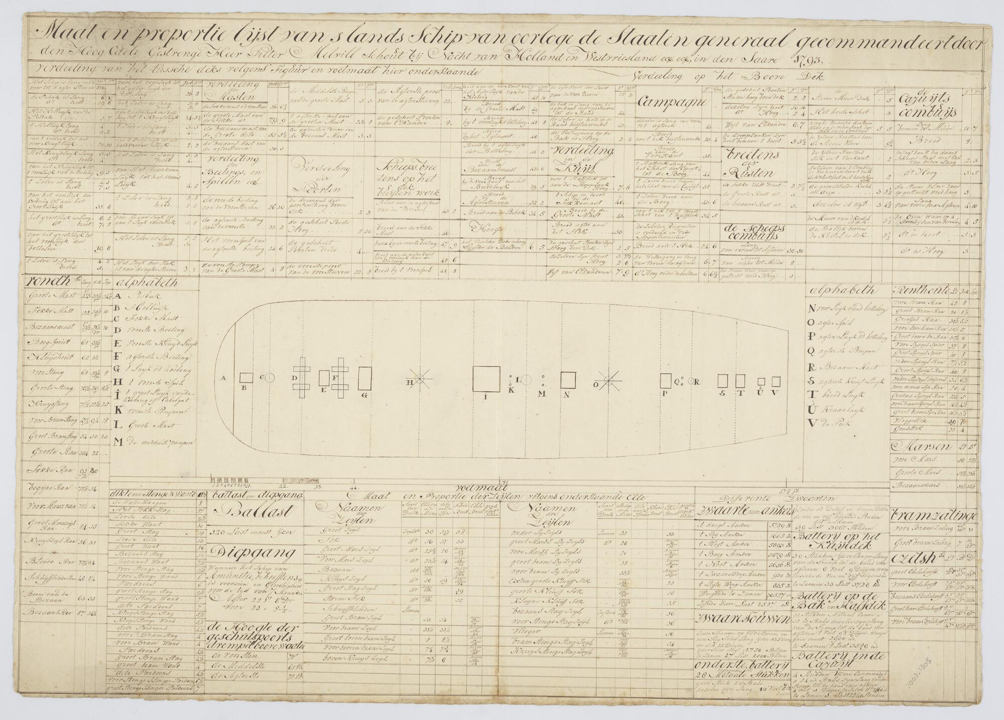 Tekening met maatvoering van 's Lands schip van oorl...