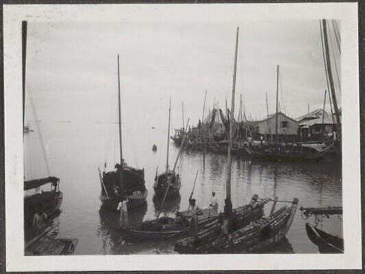 Havengezicht met vrachtvervoerende prauwen in het vi...