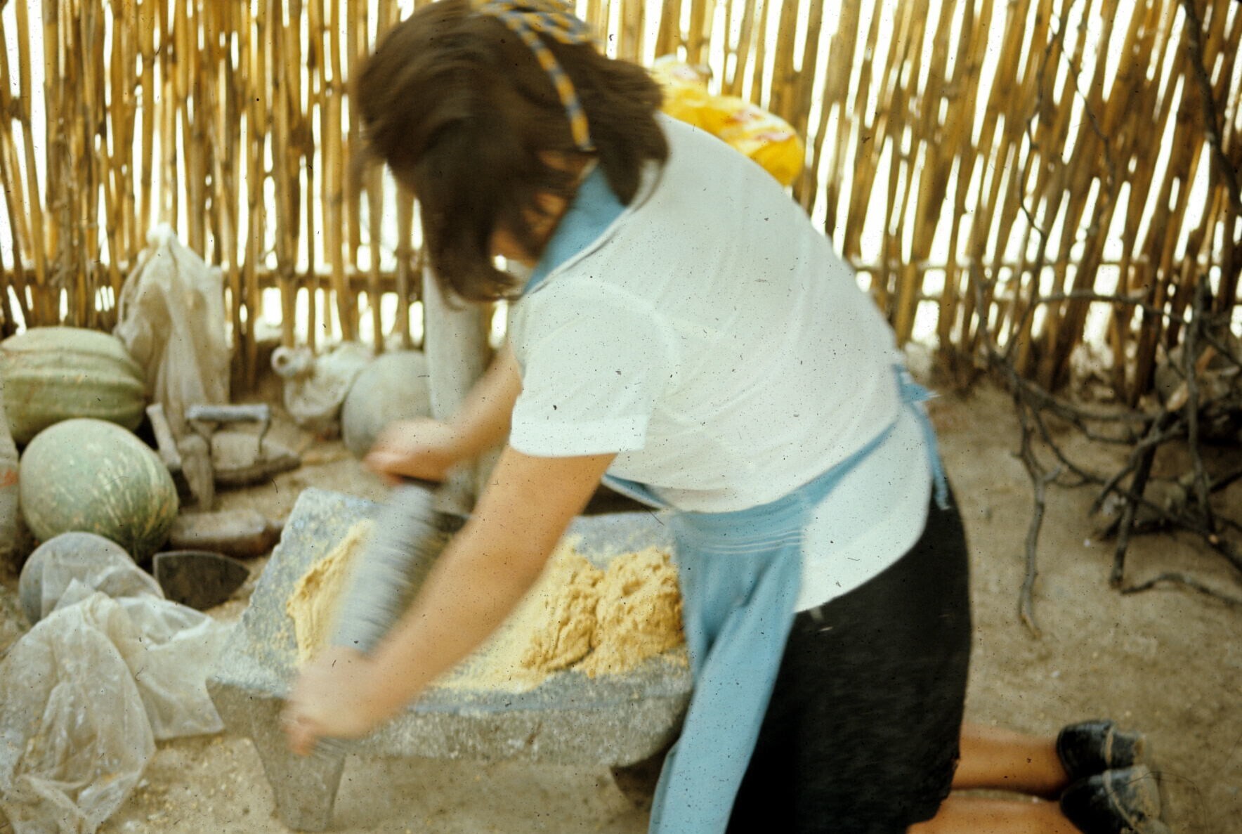 vrouw, maïs malend op metate (maalsteen)