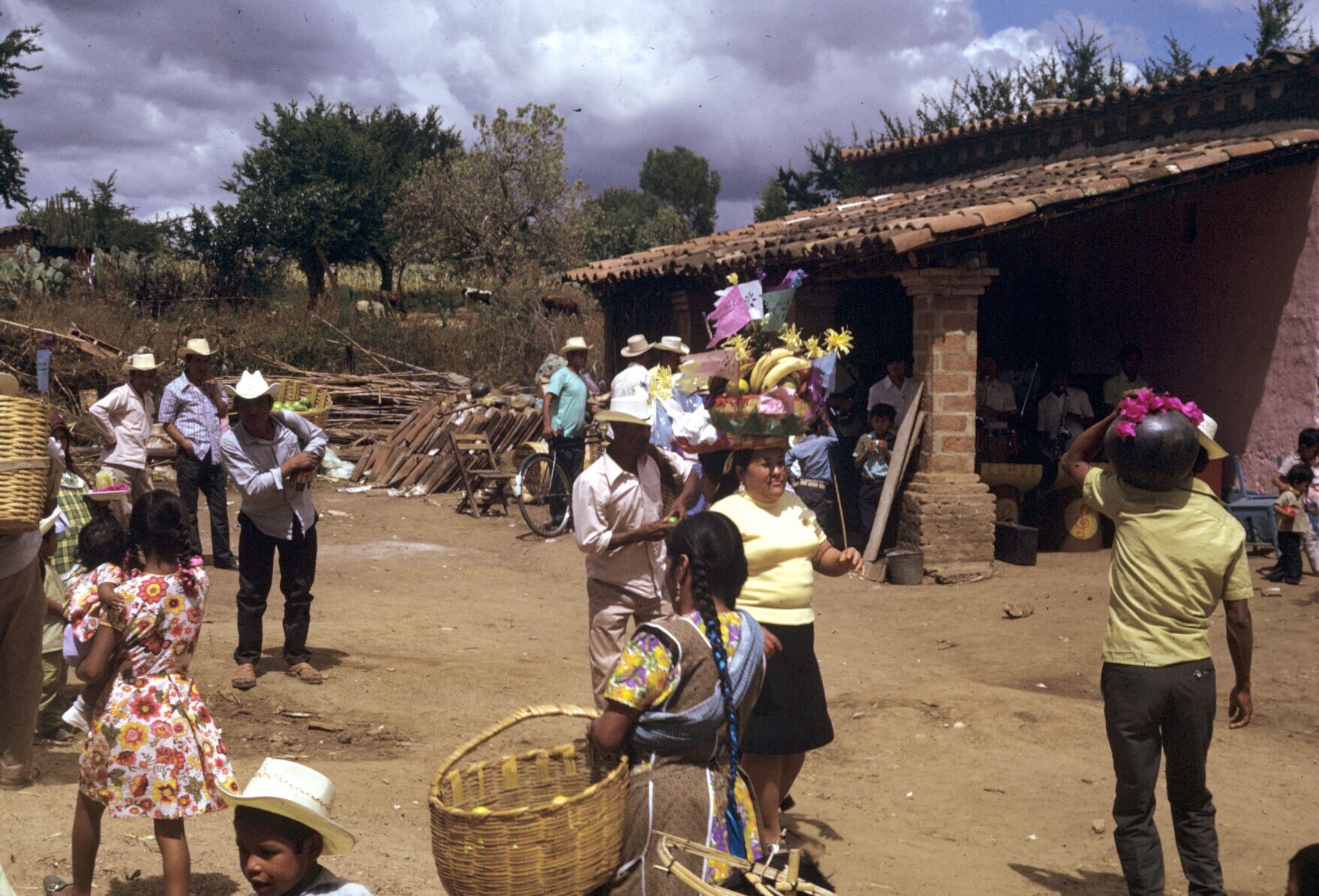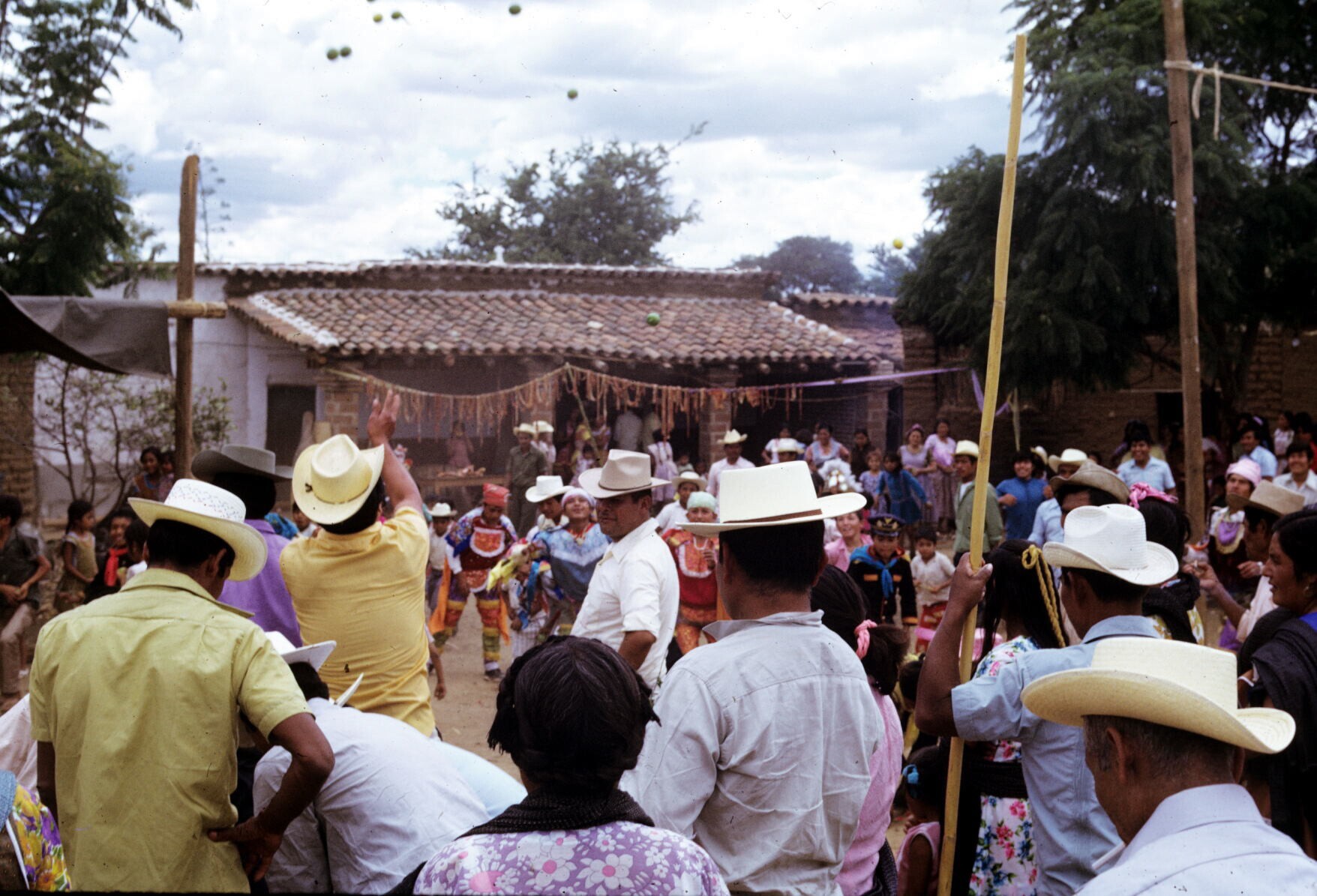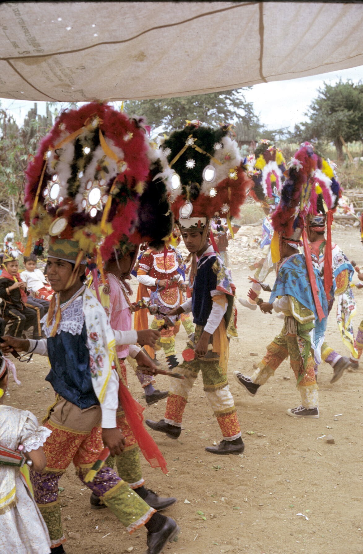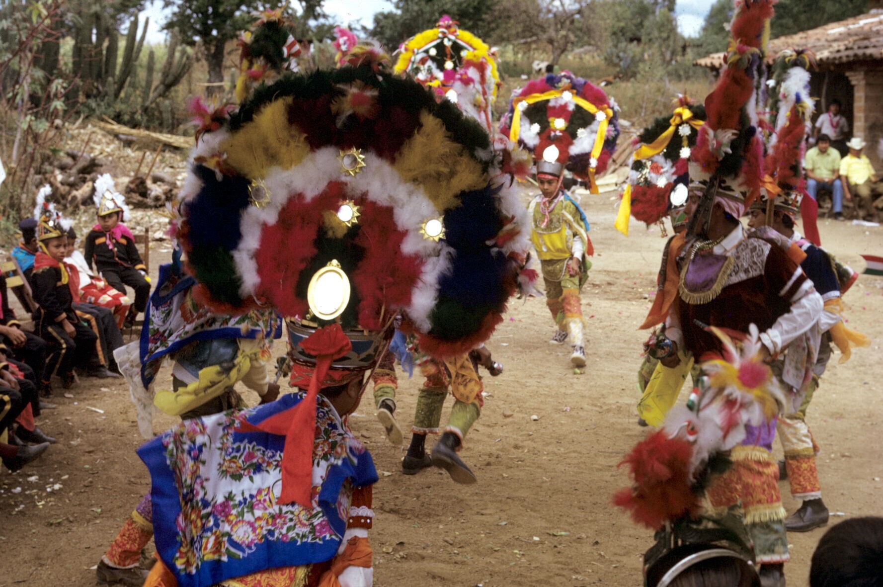 Plumadansers en publiek tijdens feest