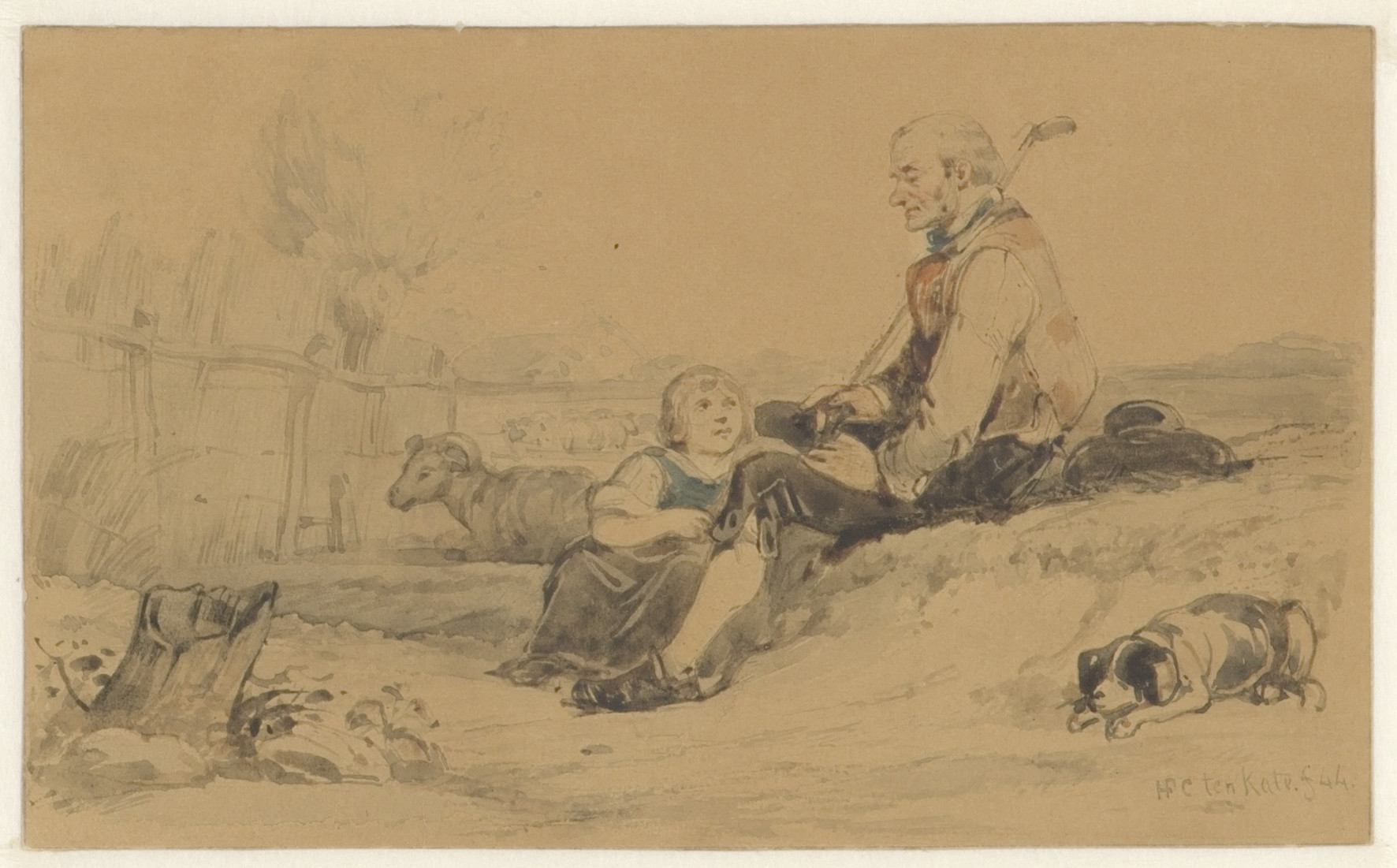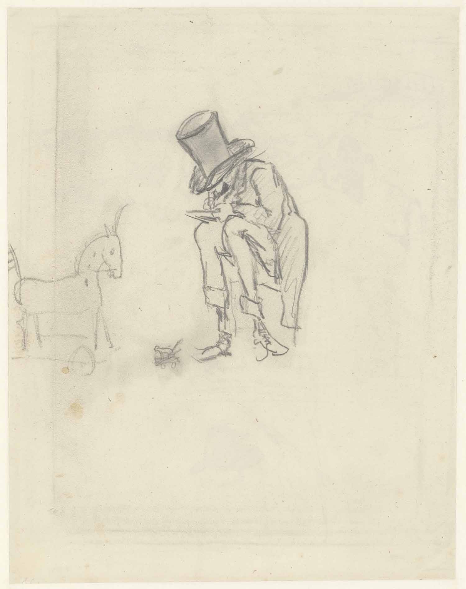 Teekenaar en speelgoedpaardje; verso: boer met hark,...