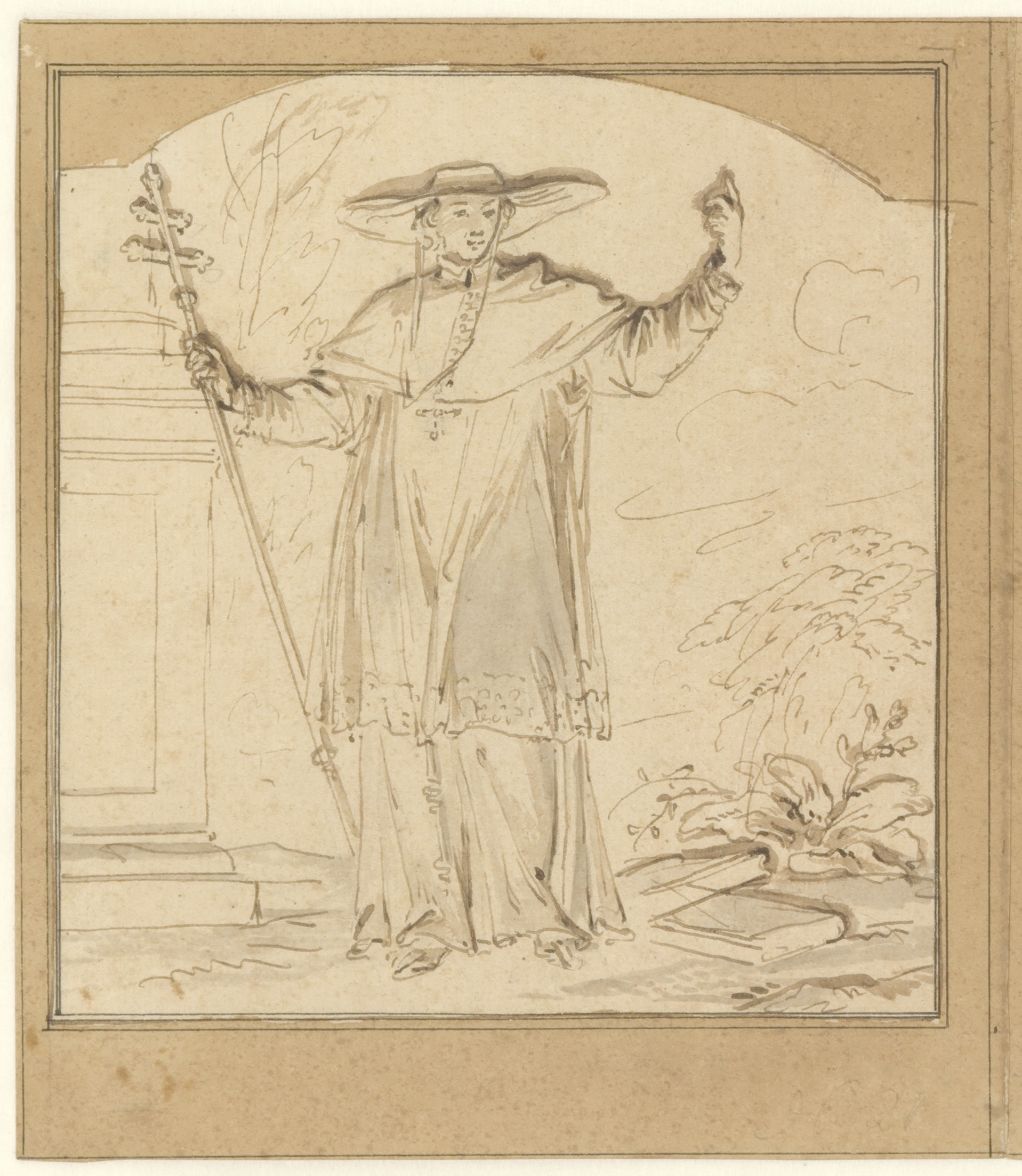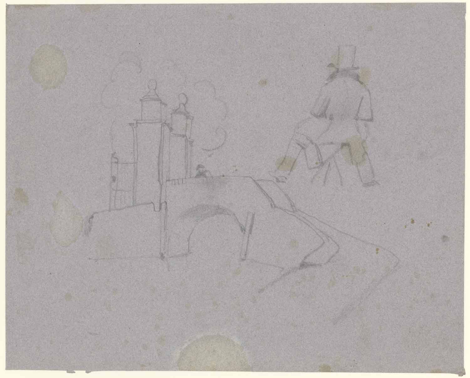 Studieblad met een tuinpoort met brug en een teekena...