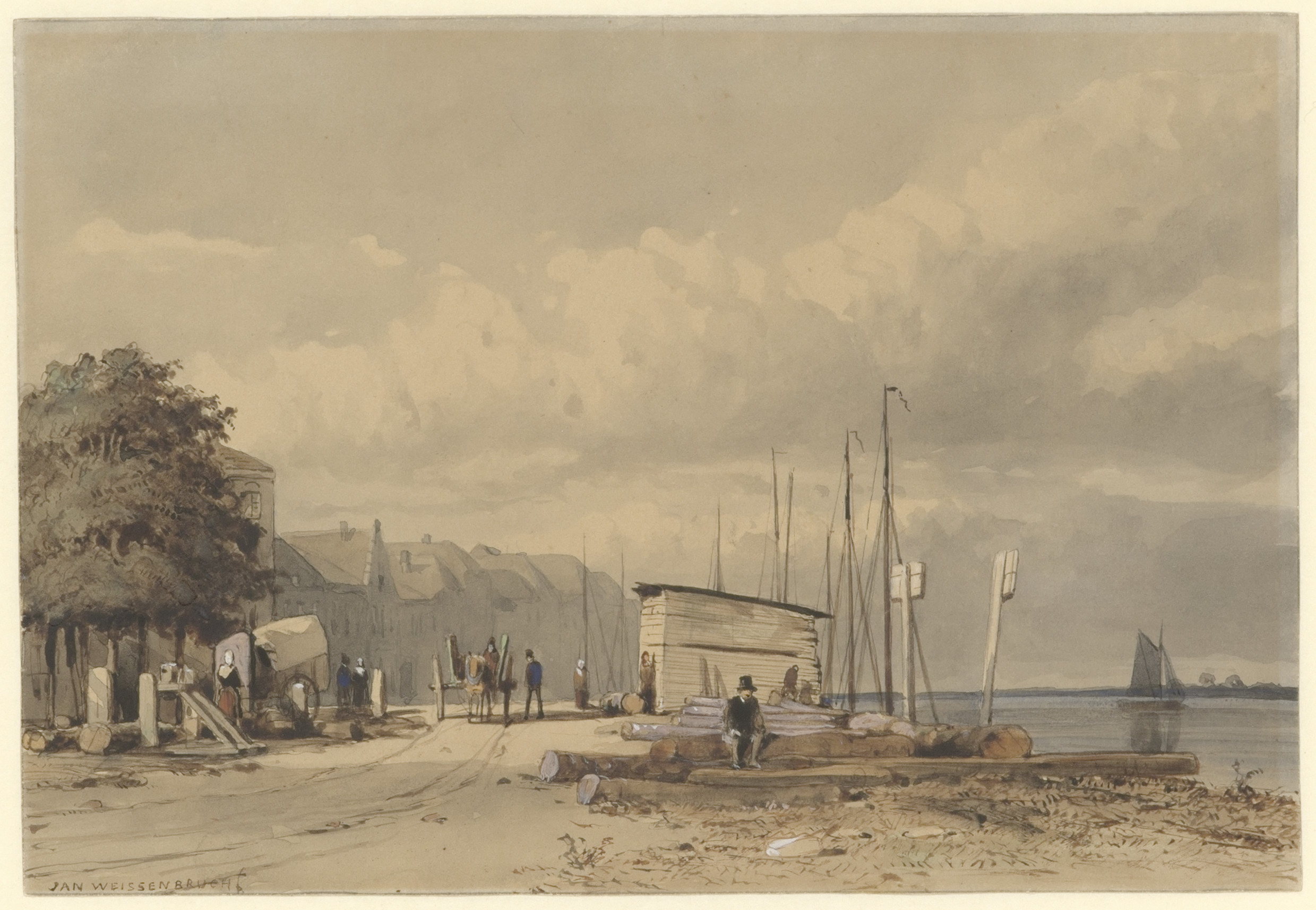 Huizen aan het water, links een zeilend schip