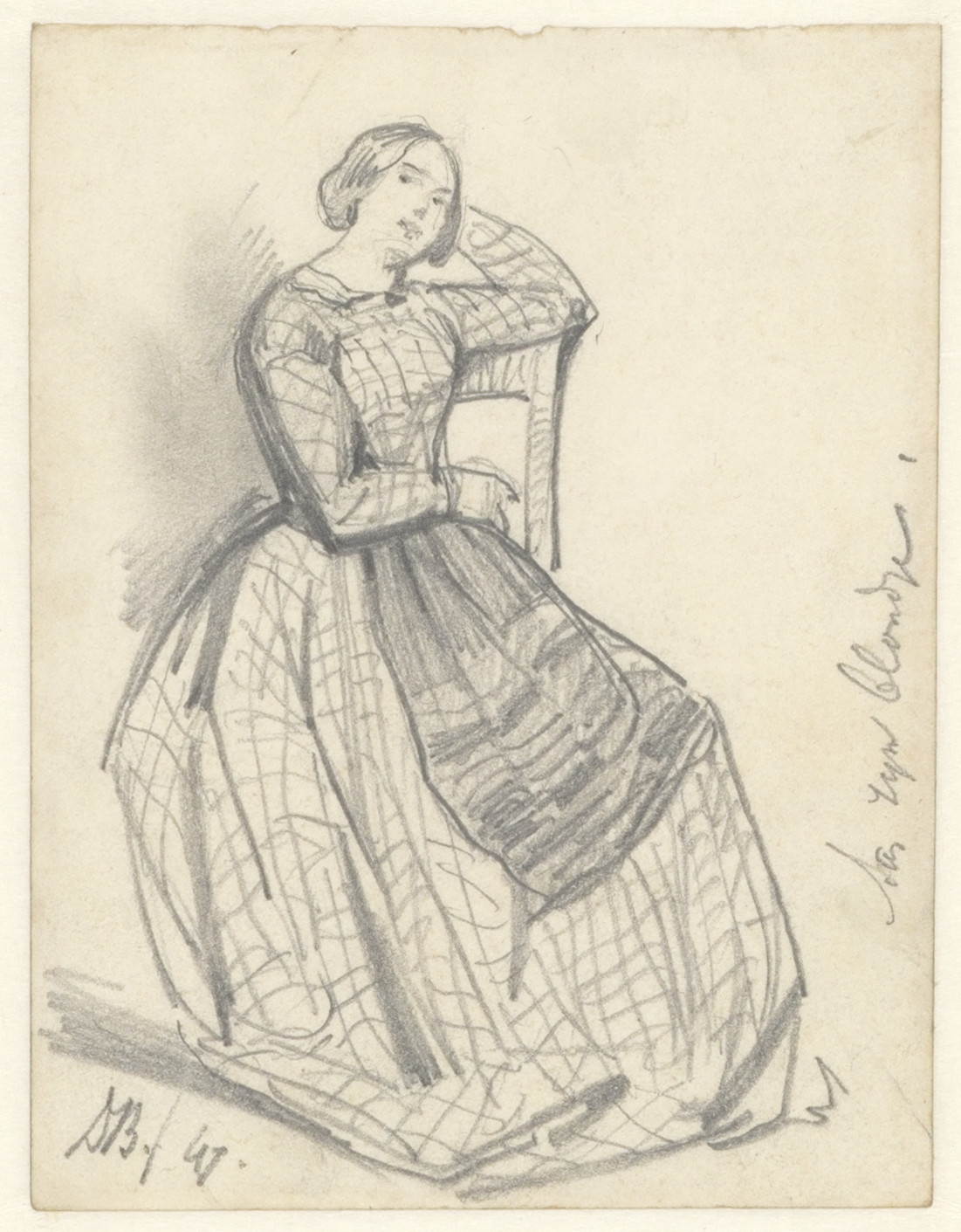 Blad met twee schetsen van een vrouw op den rug te z...