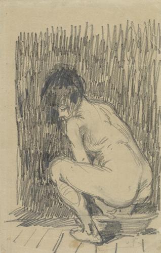Naakte vrouw hurkend boven een waskom