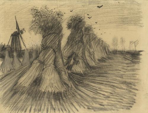 Korenschelven op de akker en een molen