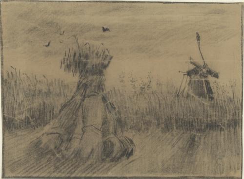 Korenveld met korenschelf en molen