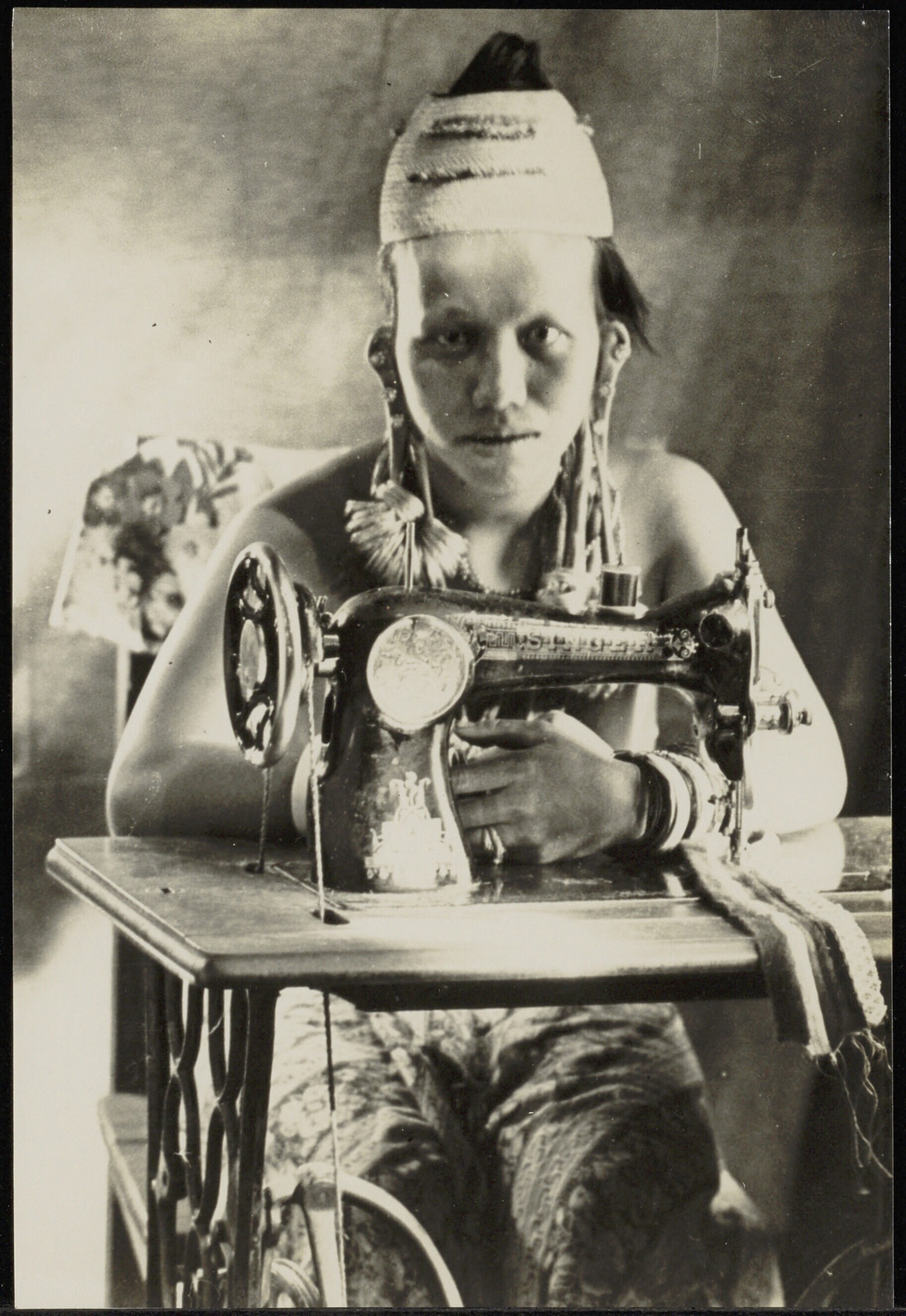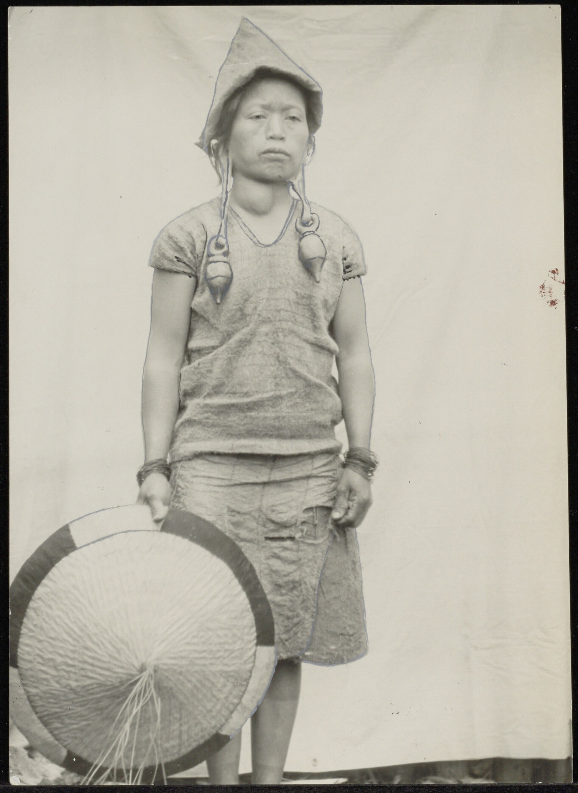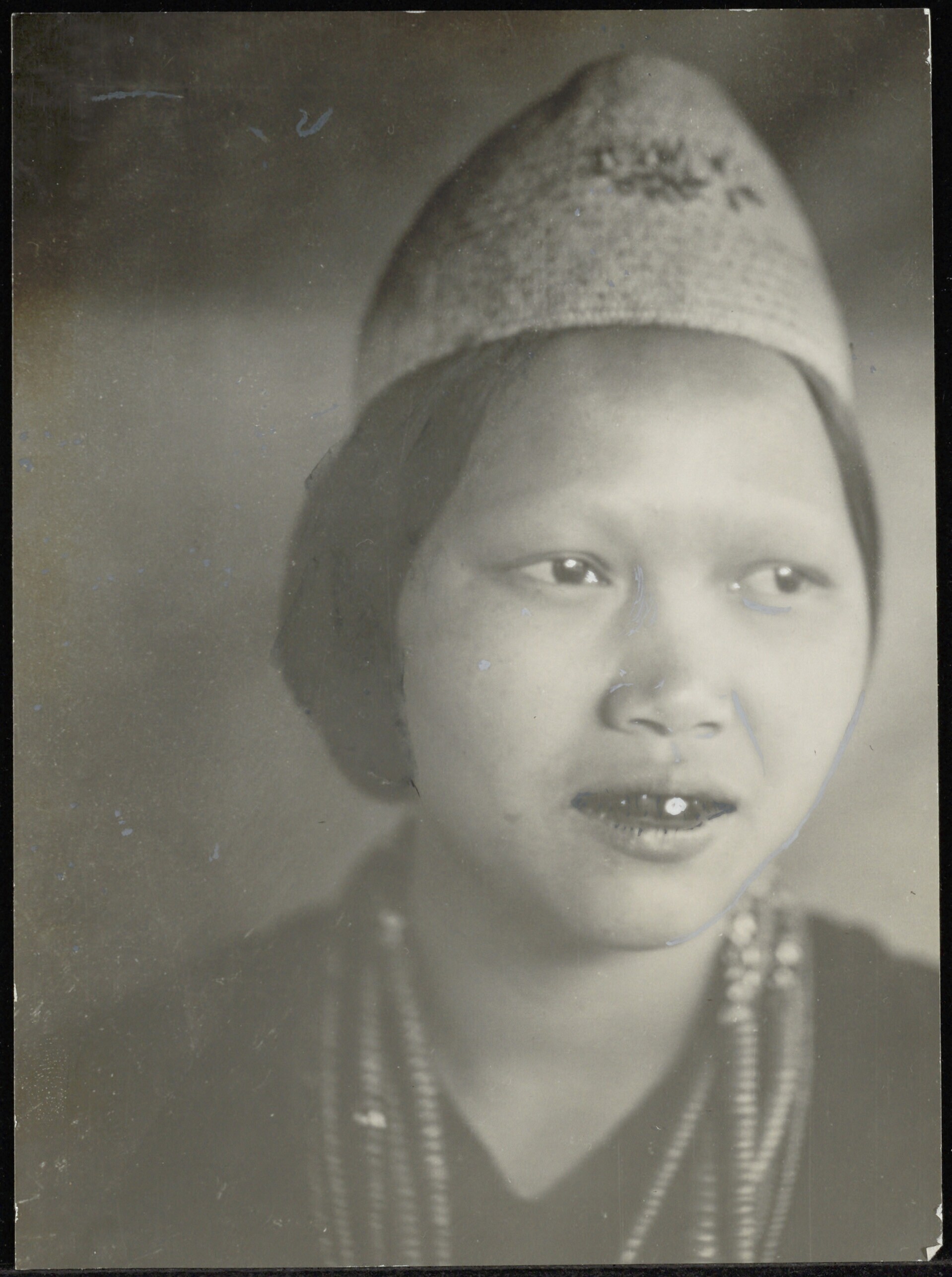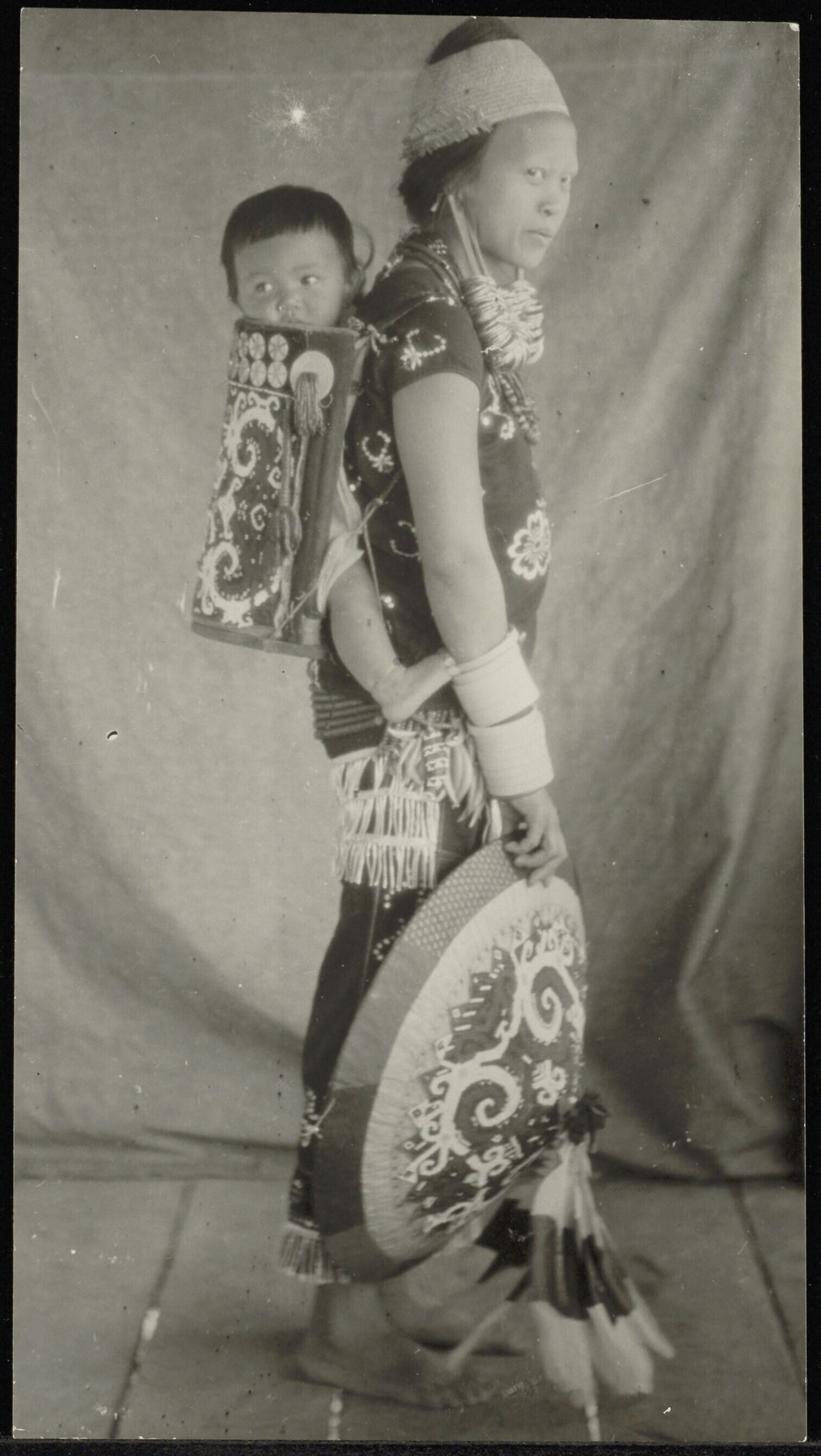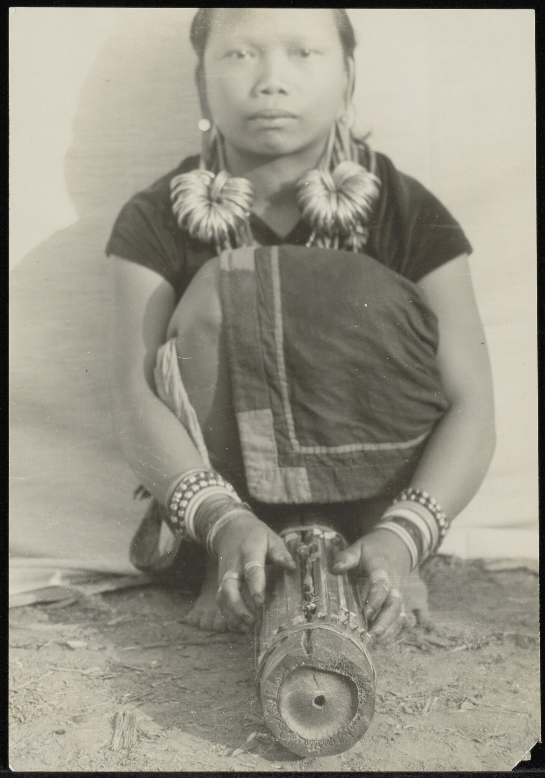 Een op de hurken zittende, fluitspelende Dayak vrouw