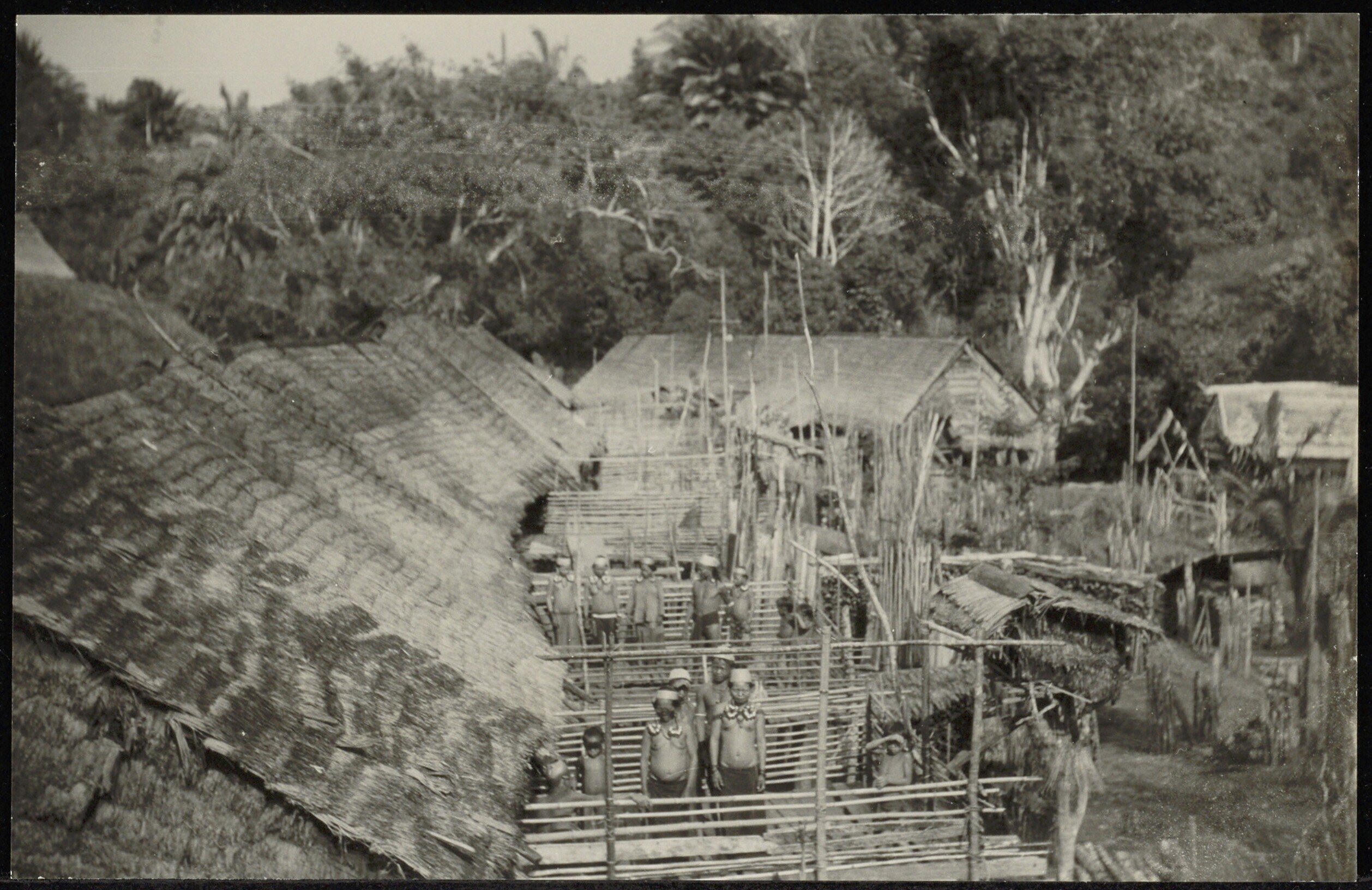 Groep Dayaks zich ophoudend bij lange, in de grond g...