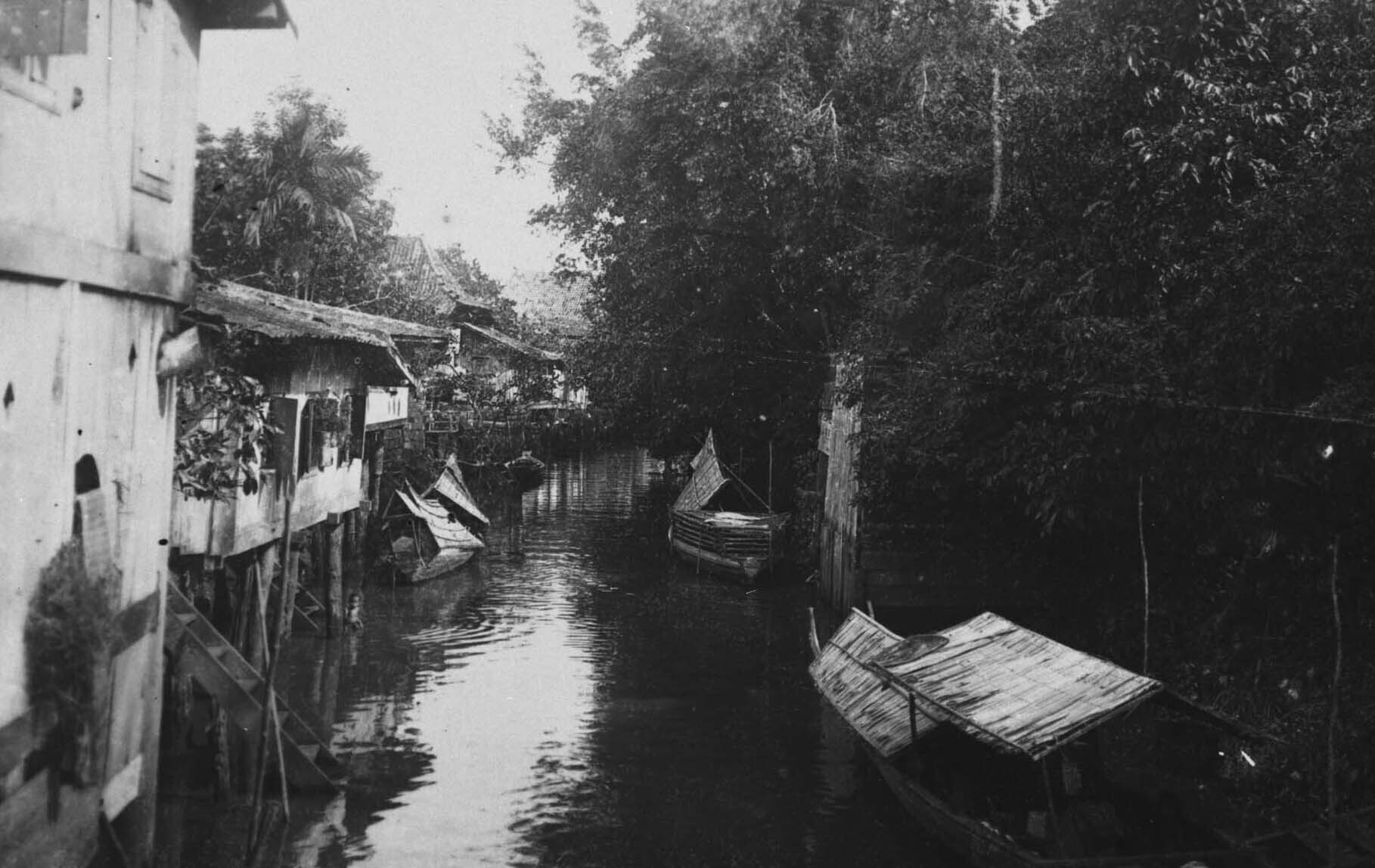 Boten in een kali langs de achterkant van woonhuizen...