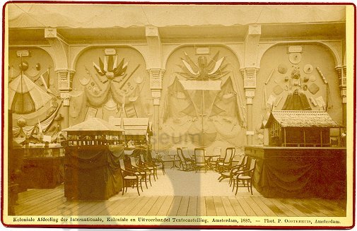 Opstelling van voorwerpen uit Nederlands-Indië in ee...