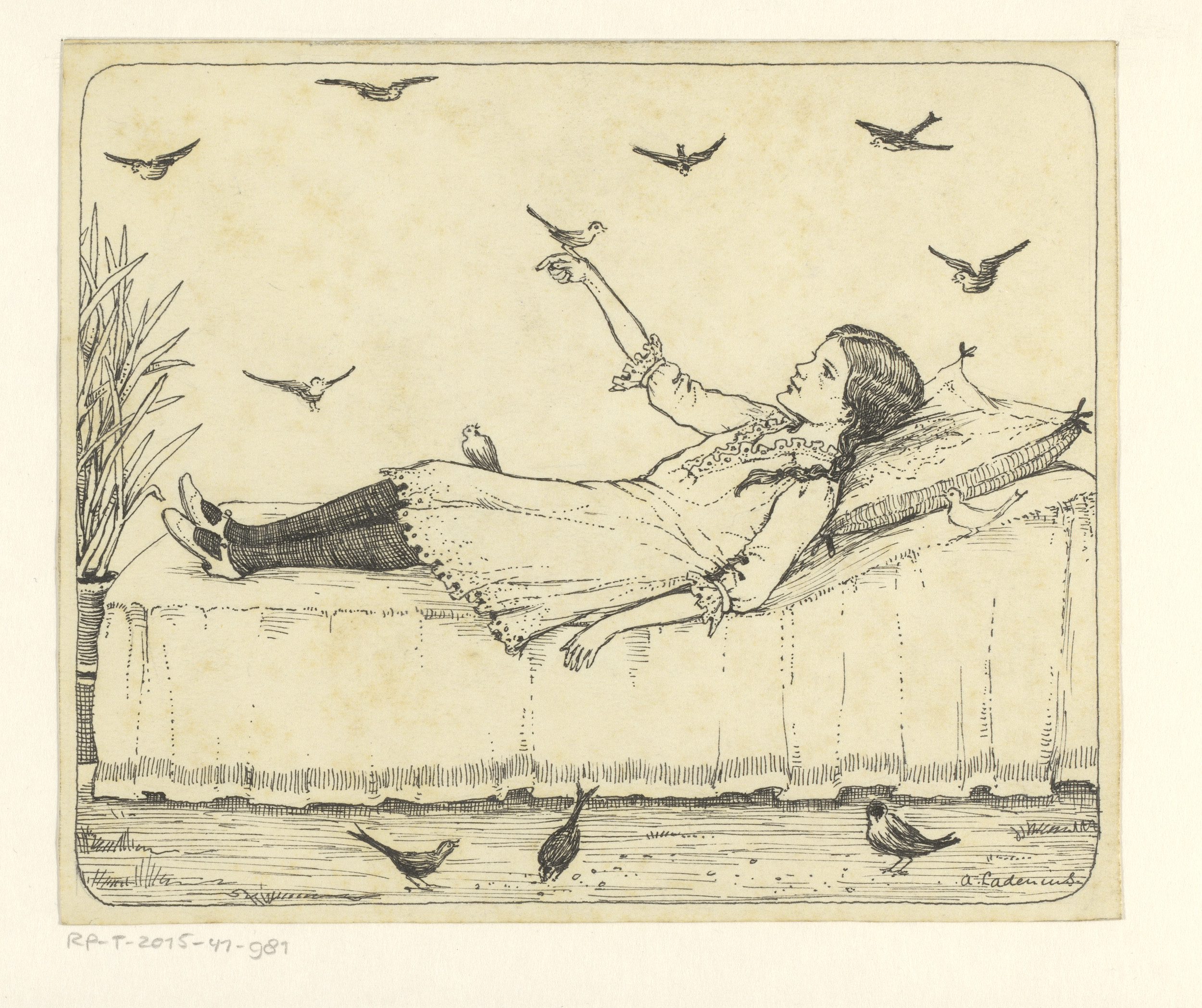 Meisje op een ligbed met vogels