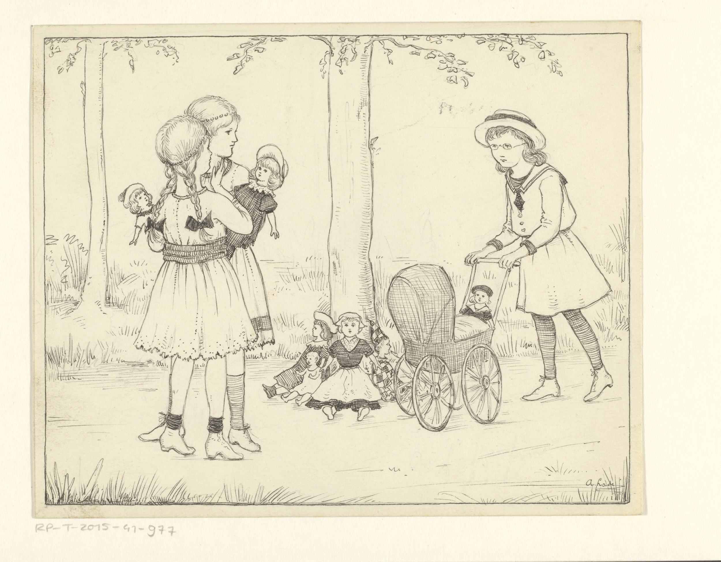 Drie meisjes met poppen op een pad
