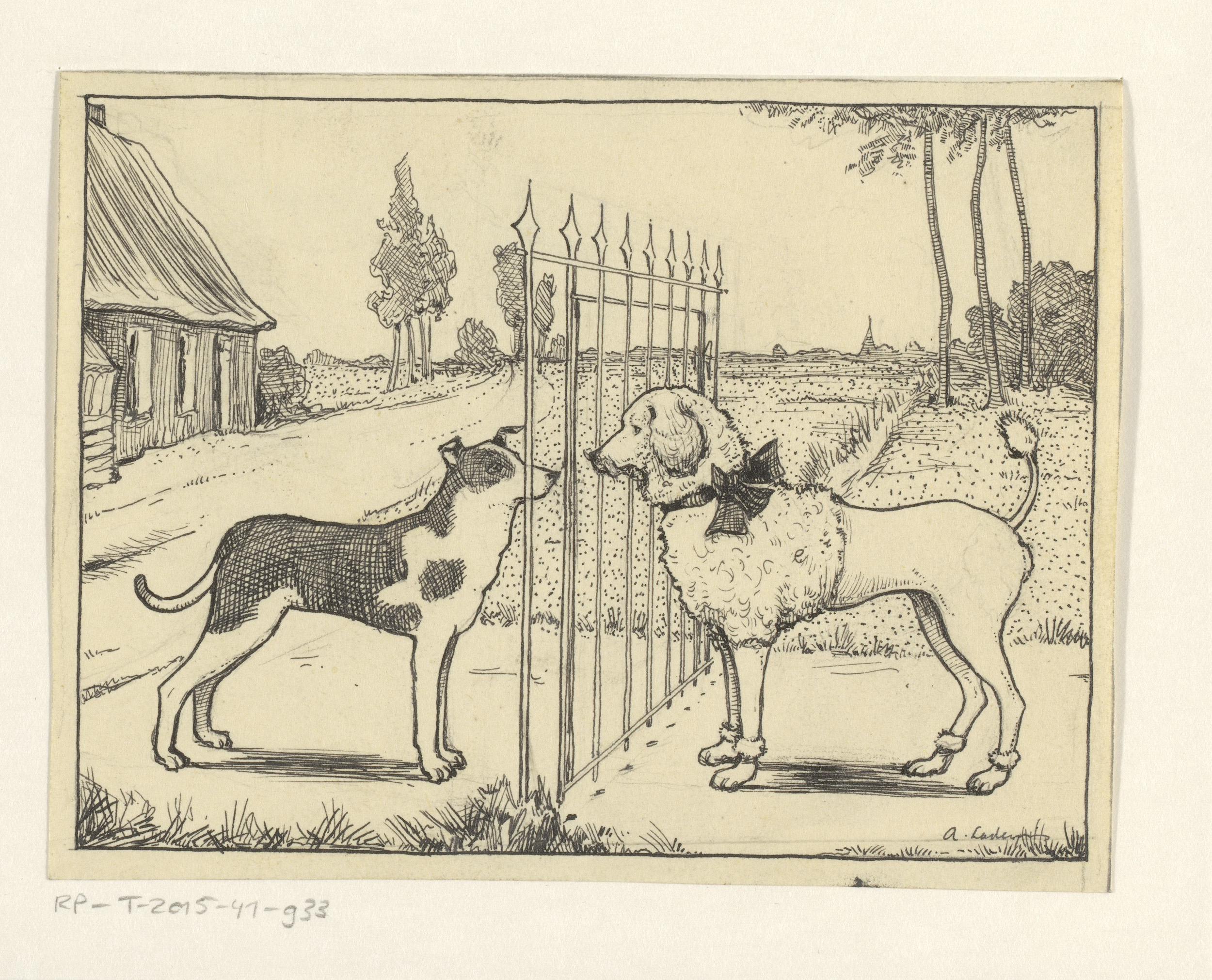 Honden Tilo en Poedel bij een hek