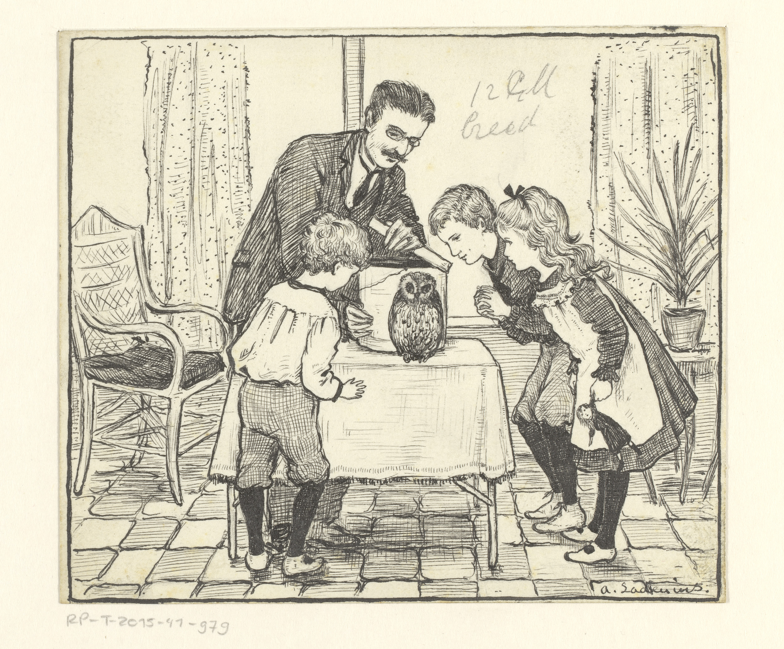 Vader en kinderen bekijken een uil