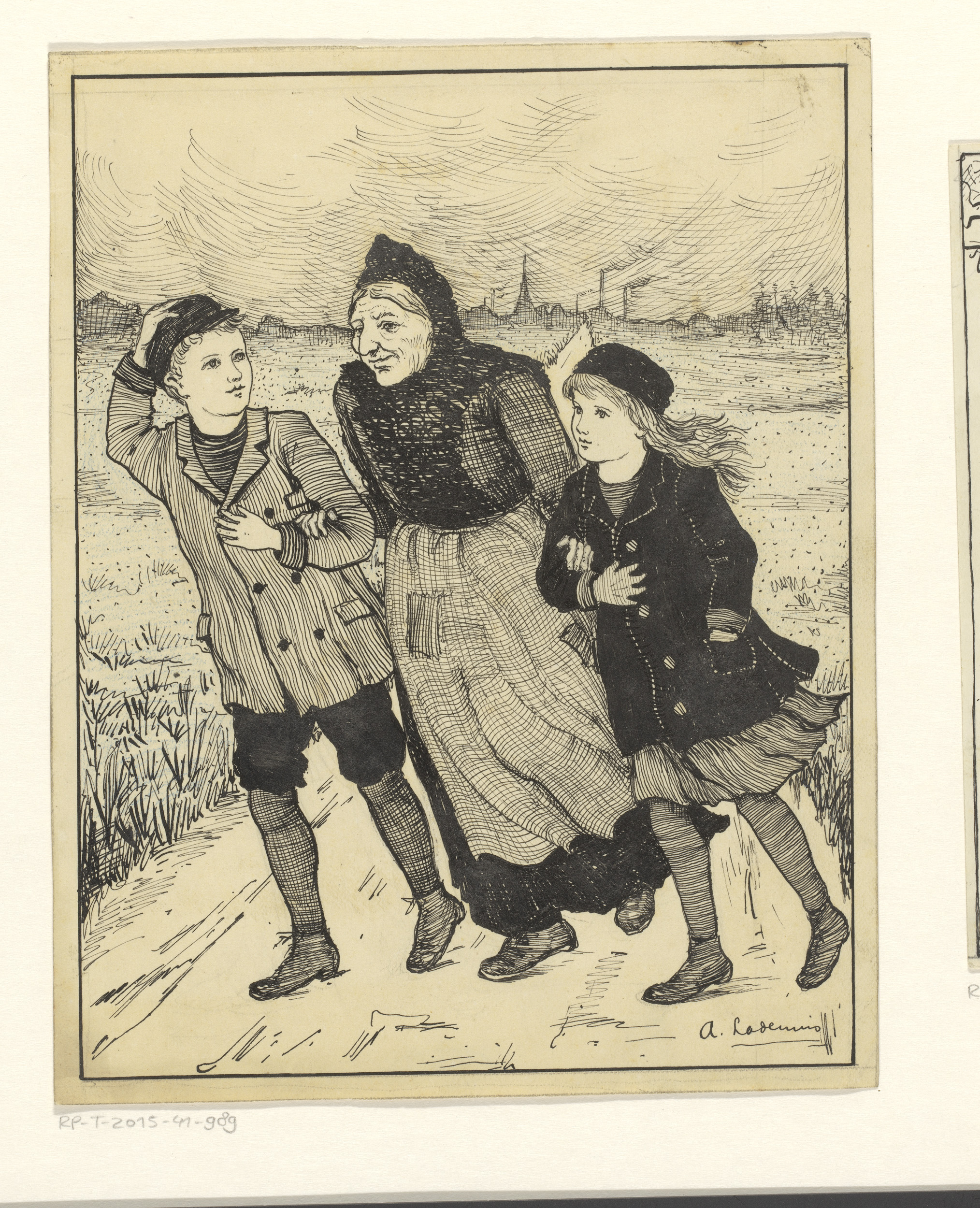 Twee kinderen lopend met een oude vrouw