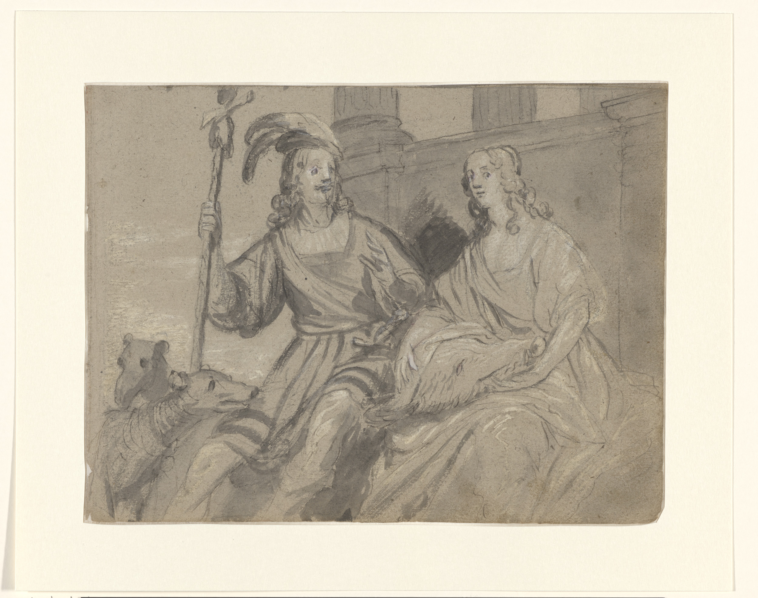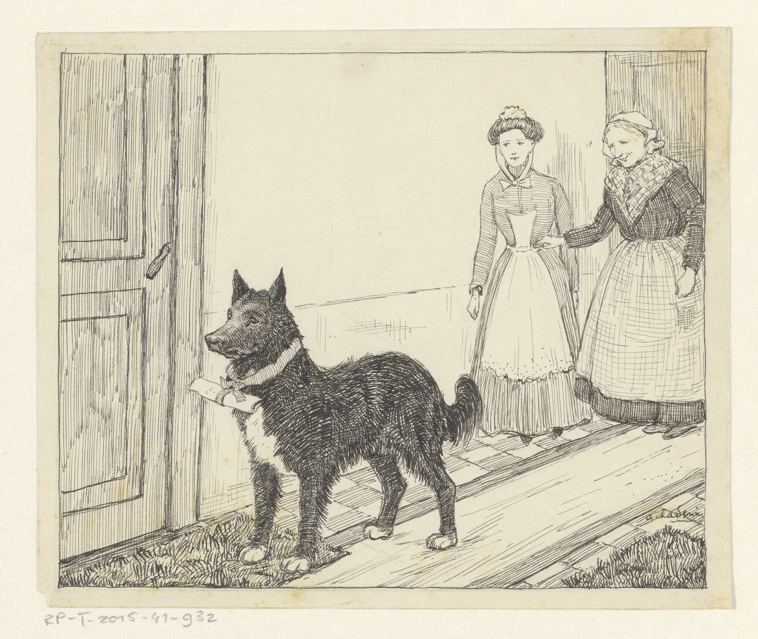 Twee vrouwen volgen een hond met een brief