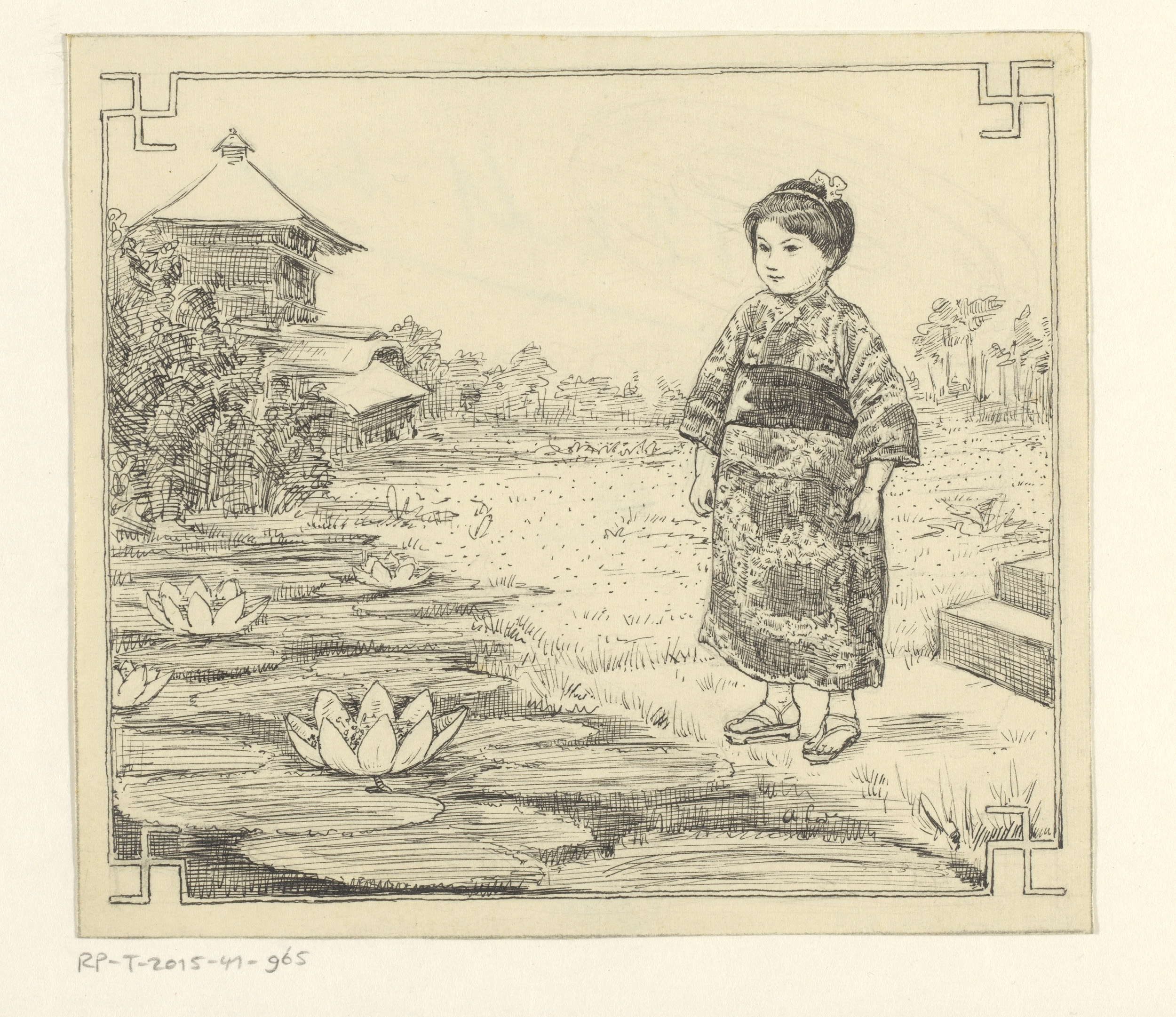 Meisje in kimono bij een vijver met lotusbloemen
