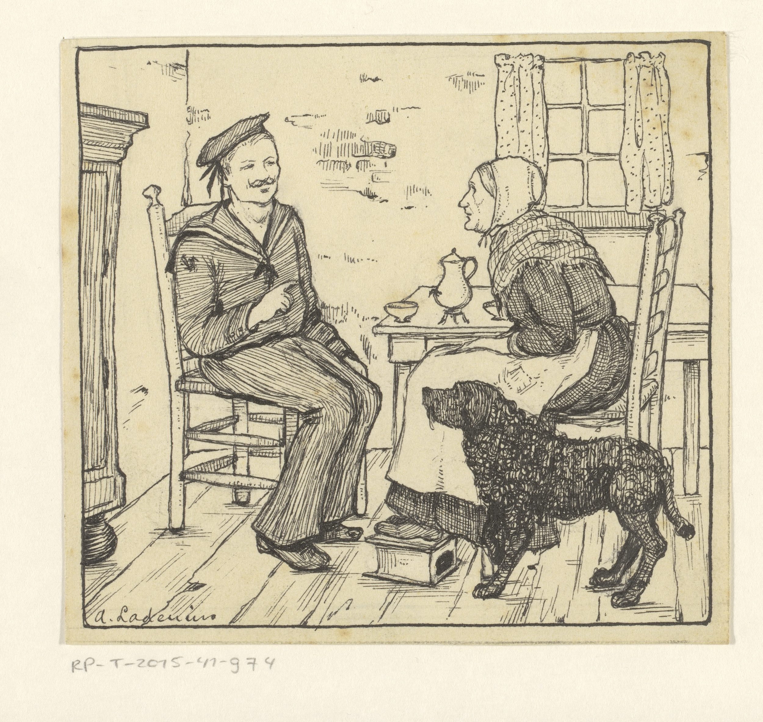 Matroos en oude vrouw in een interieur