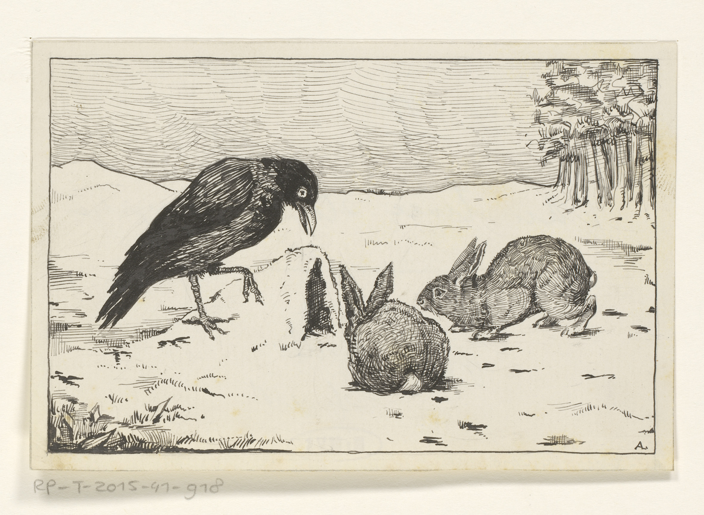 Kraai en twee konijnen bij een hol