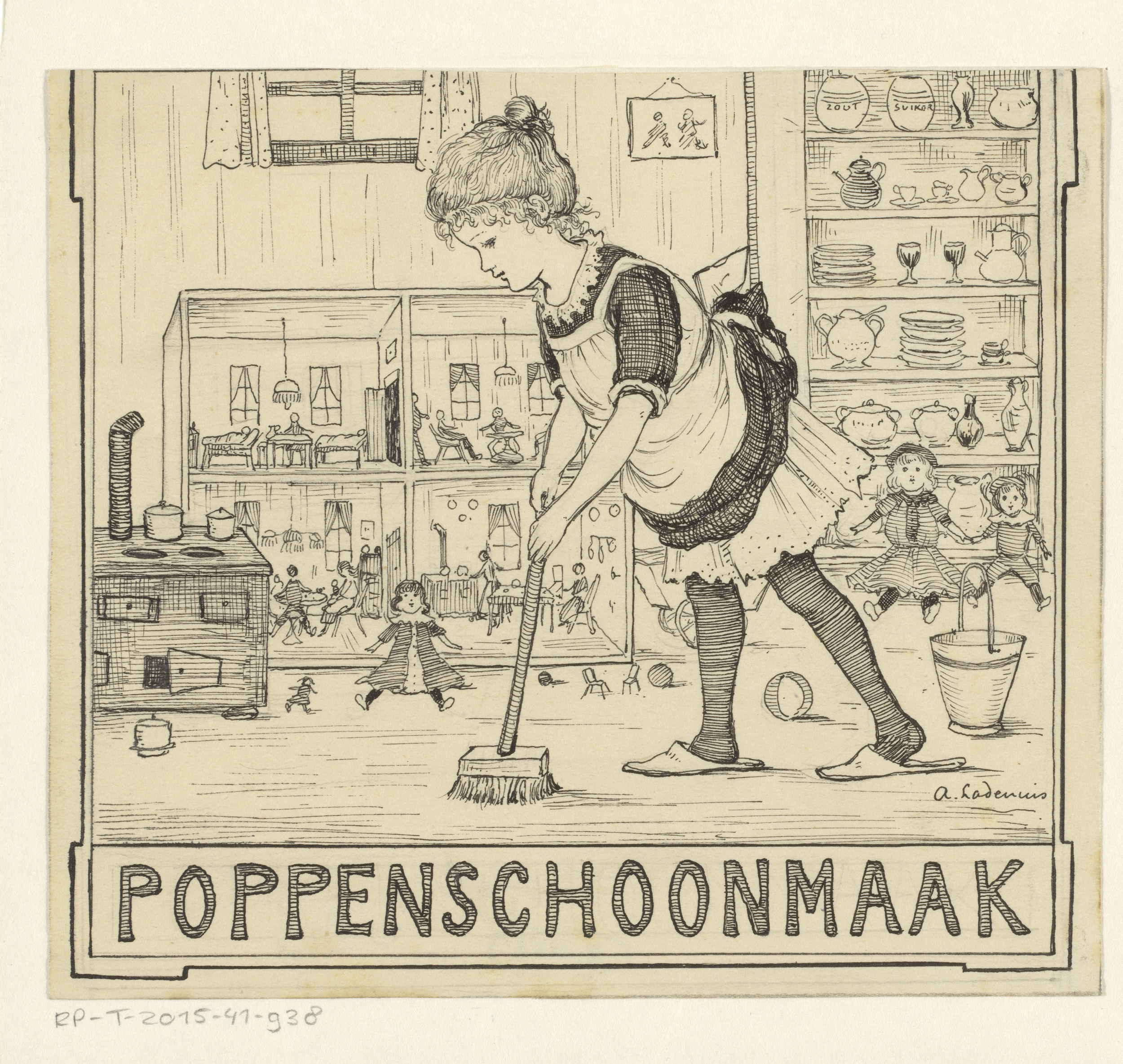 Meisje met bezem bij een poppenhuis
