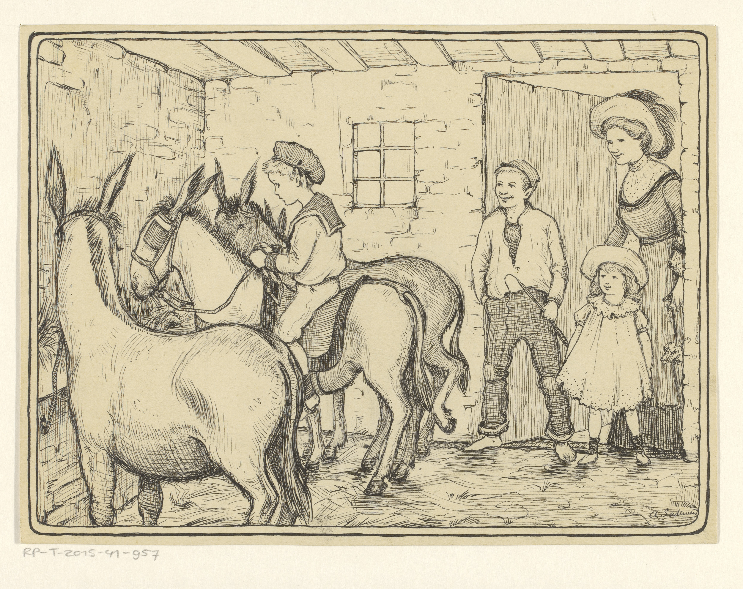 Jongen zittend op een ezel in een stal